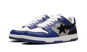 he BAPE Skate Sta #1 “Grey Blue” is a colorway of the Japanese streetwear brand’s skate-inspired shoe with blue accents. Inspired by classic skateboarding shoe aesthetics, the BAPE Skate Sta #1 has a retro look that’s both timeless and wearable. The colorway at hand features a combination of materials, including white leather on the perforated toe, blue tumbled leather on the overlays, and dark grey suede on the mid-panel and collar. A black BAPE “Star” logo can be found on both sides of the shoe, while “BAPE STA” detailing is embroidered on the heel tab and tongue tag. The off-white-colored rubber midsole features a “BAPE” logo on the lateral heel. A blue rubber outsole completes the look.