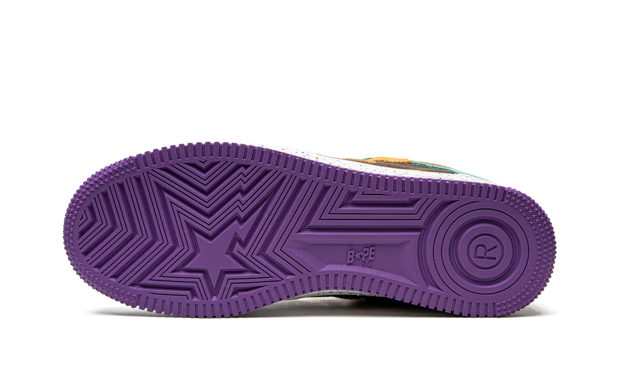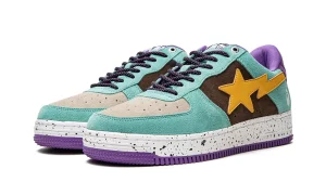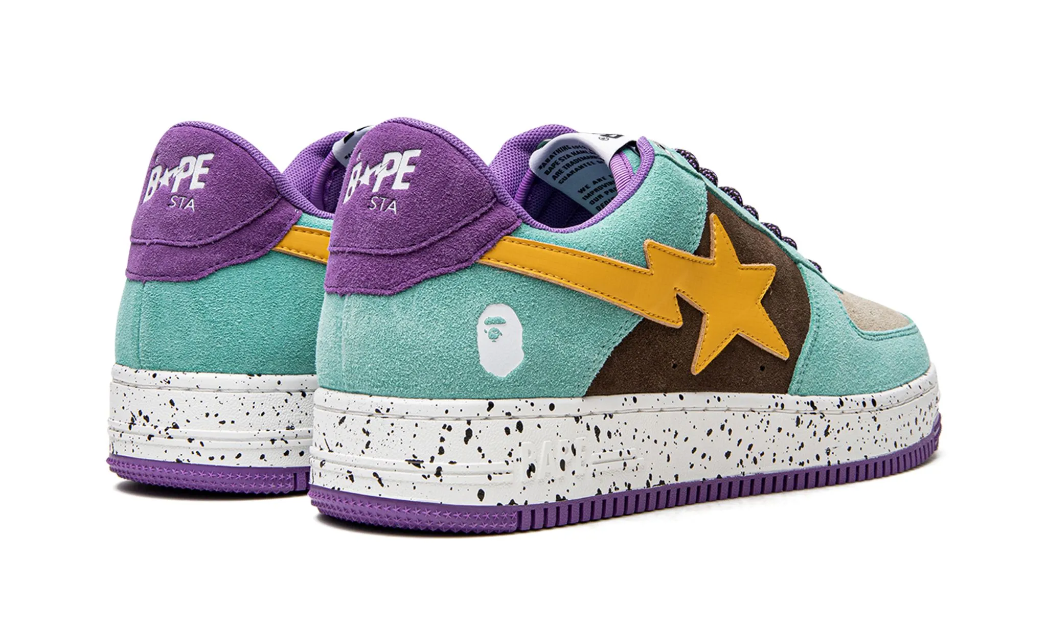 The A Bathing Ape Bape Sta Low 'Teal Brown Yellow Suede' combines luxurious texture with eclectic color accents. These low-top sneakers feature the classic Bape Sta silhouette crafted from premium suede in a distinctive teal, brown, and yellow color palette. The shoe's design is enriched by subtle Bape Sta star logos on the sides, maintaining the brand's iconic detailing. A durable rubber sole ensures comfort and stability, making these sneakers suitable for everyday wear. Ideal for those seeking a unique and stylish addition to their collection, the Bape Sta Low 'Teal Brown Yellow Suede' exemplifies Bape's renowned blend of urban fashion and streetwear influence.