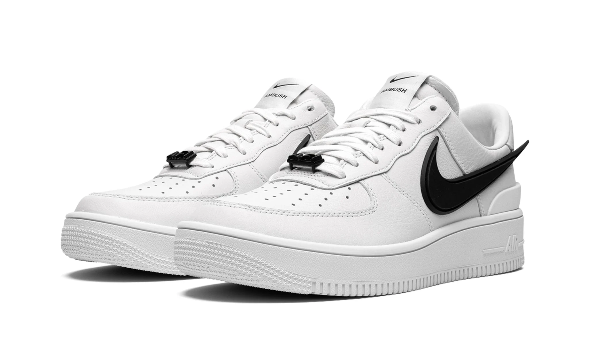 The Ambush x Nike Air Force 1 Low “Phantom” is a collaboration by Yoon Ahn and Verbal’s luxury jewelry brand that puts a premium and futuristic spin on the retro basketball shoe. Simply dubbed the “Phantom” colorway, Ambush’s take updates the Air Force 1 Low with a two-tone, white-and-black color block that excels in versatility. The shoe’s upper features a white leather construction. A black elongated Swoosh is found on either side and extends off the heel. A TPU heel overlay ties into the shoe’s contemporary vibe. A co-branded tongue tag features logos by Ambush and Nike. Underfoot, the white rubber sole completes the shoe’s clean appearance.