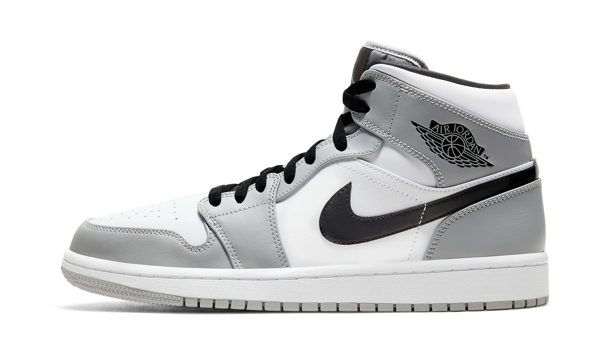 The Air Jordan 1 Mid “Light Smoke Grey” finds Michael Jordan’s first signature shoe in mid-top form in a shadowy, ultra versatile color scheme. The Jordan 1 Mid has gained popularity in sneaker culture for its unique mid-top shape and range of desirable colorways. Both aspects come into play on the “Light Smoke Grey” colorway. White leather forms the base of the upper, appearing on the perforated toe, mid-panel, and collar. Light Smoke Grey leather overlays can be found on the forefoot, eyelets, collar, and heel. A black leather Swoosh is located on each side and black “Wings” branding dots the collar. Jordan Brand finishes off the look of this subdued design with a grey nylon tongue, black laces, and black nylon tongue tab with grey Jumpman detailing.