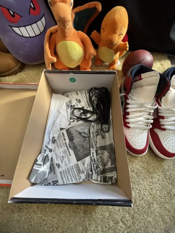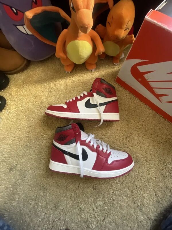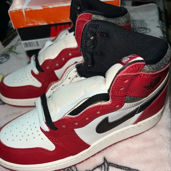 The Air Jordan 1 High “Lost & Found” is the highly anticipated re-release of the original colorway of Michael Jordan’s signature shoe that draws inspiration from the model’s 1985 release. The “Lost and Found” replicates the look and feel of the debut version of the “Chicago” from the ‘80s. It features accurate-to-original panel shapes and colors, and a decidedly aged, vintage look. The perforated toe and mid-panel are designed in white leather. The neutral base is accented by red leather overlays. A black leather Swoosh appears on both sides of the shoe. Classic “Air” and Swoosh branding can be found on the red nylon tongue tag. Underfoot, a white midsole and black rubber outsole complete the look.