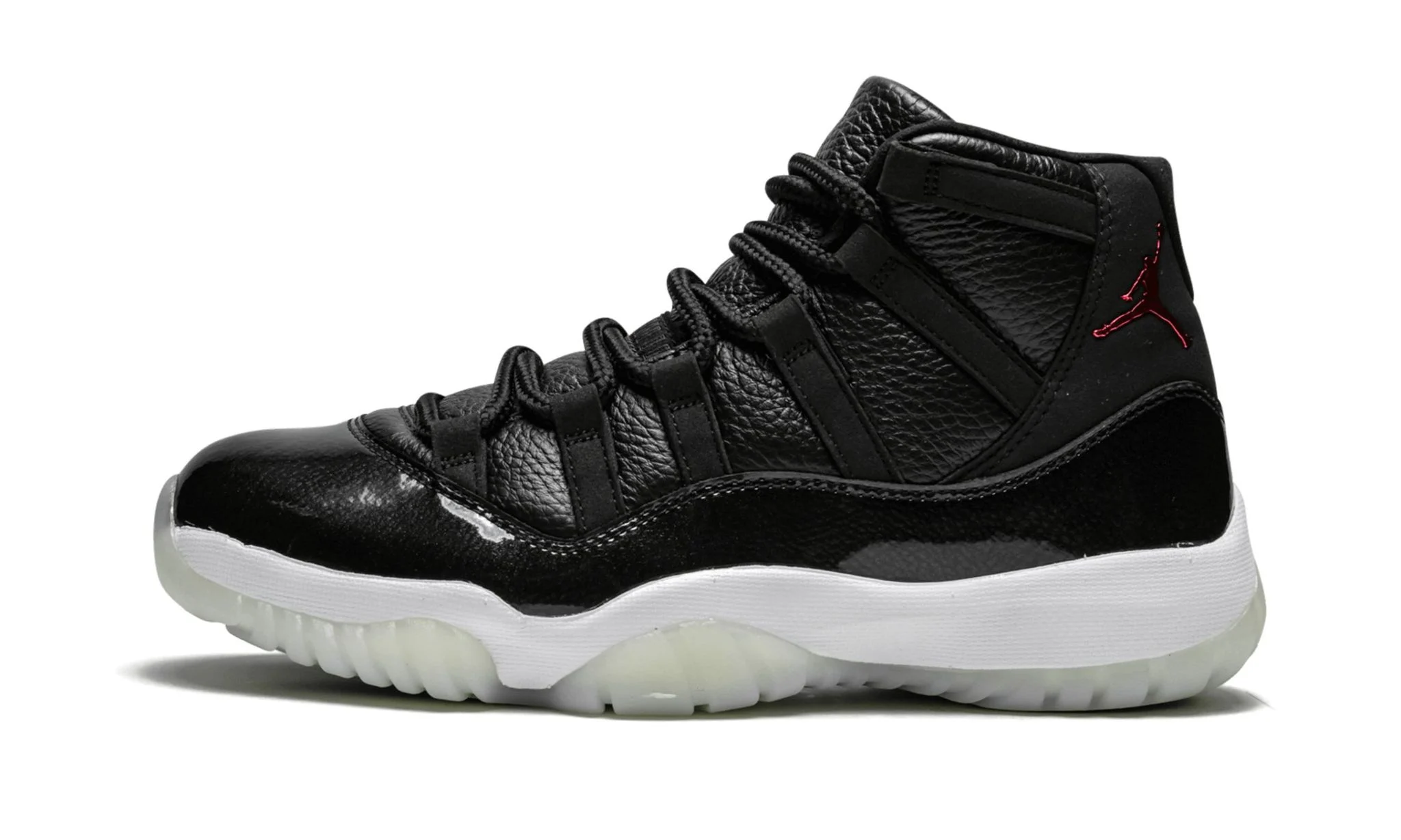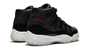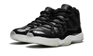 The Air Jordan 11 Retro '72-10' pays homage to the Chicago Bulls' historic 1995-96 NBA season, where they set a record with 72 wins and 10 losses. This edition features a luxurious black tumbled leather upper with contrasting red accents on the Jumpman logo and heel tab. The patent leather mudguard adds a glossy finish, complemented by a translucent outsole and metallic Jumpman logo. Underneath, the shoe incorporates responsive cushioning with a full-length Air-Sole unit and Phylon midsole for exceptional comfort and support. The Air Jordan 11 Retro '72-10' combines iconic design elements with premium materials, making it a sought-after choice for both collectors and sneaker enthusiasts alike.