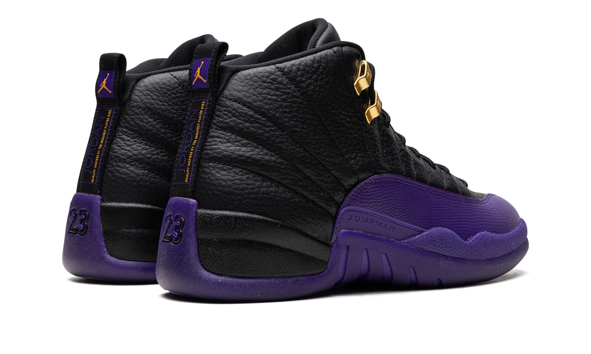 The Air Jordan 12 “Field Purple” is a two-tone colorway of the retro basketball shoe loosely inspired by the Los Angeles Lakers. While not associated with the team, the “Field Purple” Jordan 12 nonetheless shows love to the Lakers with its purple accenting. The look is also likely inspired by the Player Exclusive Air Jordan 12 colorways that were worn by Gary Payton with the Lakers in the 2003-04 NBA season. The shoe has a black tumbled leather construction with a Field Purple mudguard. More purple accenting appears on the Jumpman and “Two 3” branding on the black leather tongue.