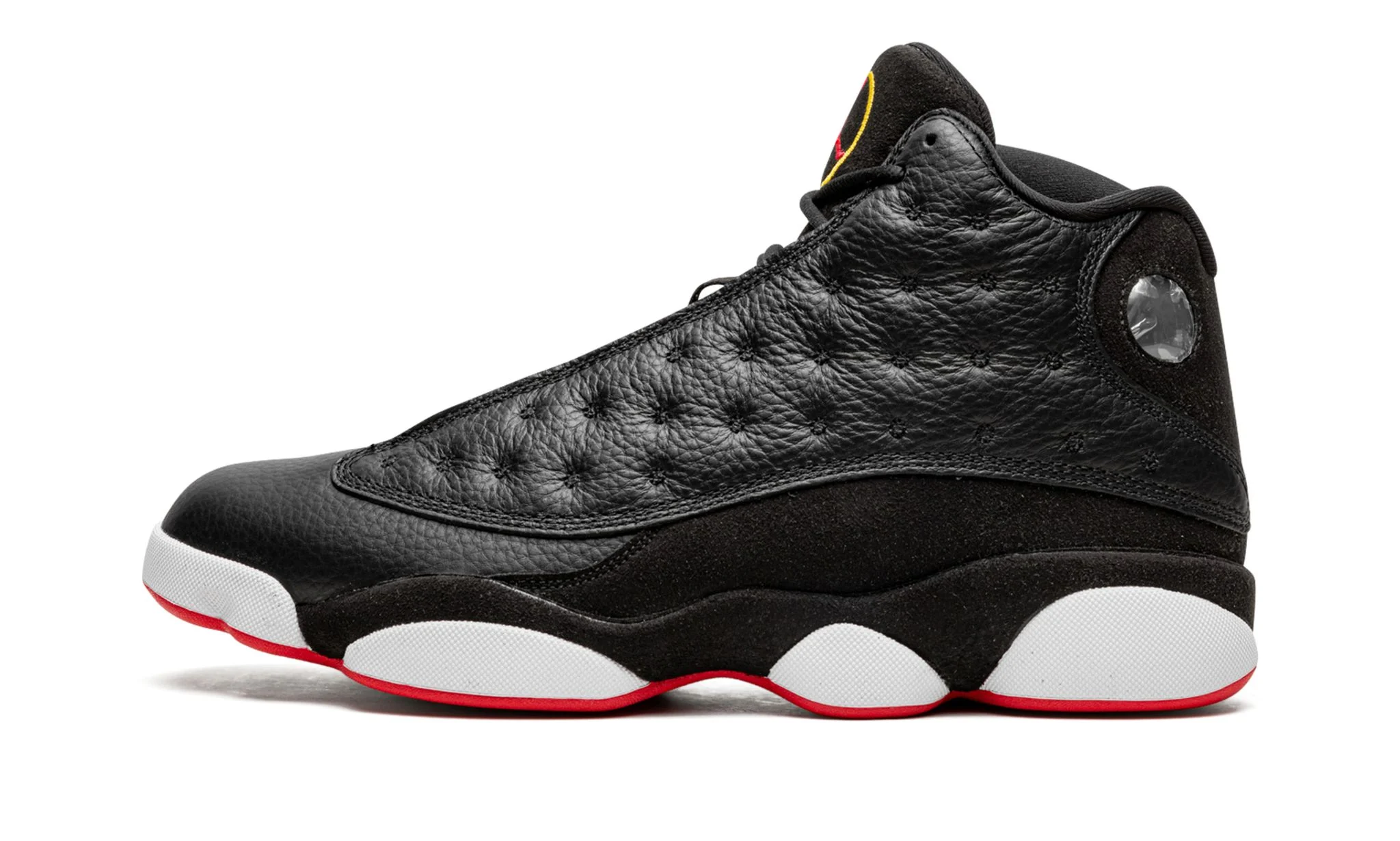 The Air Jordan 13 “Playoffs 2023" is the modern re-release of a popular, original colorway of Michael Jordan’s thirteenth signature shoe. The Jordan 13 “Playoffs” was debuted by Jordan during the 1998 NBA All-Star Game before it was eventually worn by “His Airness” during the Chicago Bulls’ memorable run during the ‘98 NBA Playoffs. The 2023 version of the “Playoffs” is a true one-to-one remaster of the original iteration of the shoe that was released in 1998. The colorway features a dotted black leather upper, a black leather toe, and black suede mudguard. A holographic, panther-eye-inspired emblem is found on the lateral side of the collar. Classic Jumpman branding appears in red within a yellow embroidered circle on the tongue. “Jordan” detailing is found on the vamp. White midsole walls complete the look of this classic sneaker.