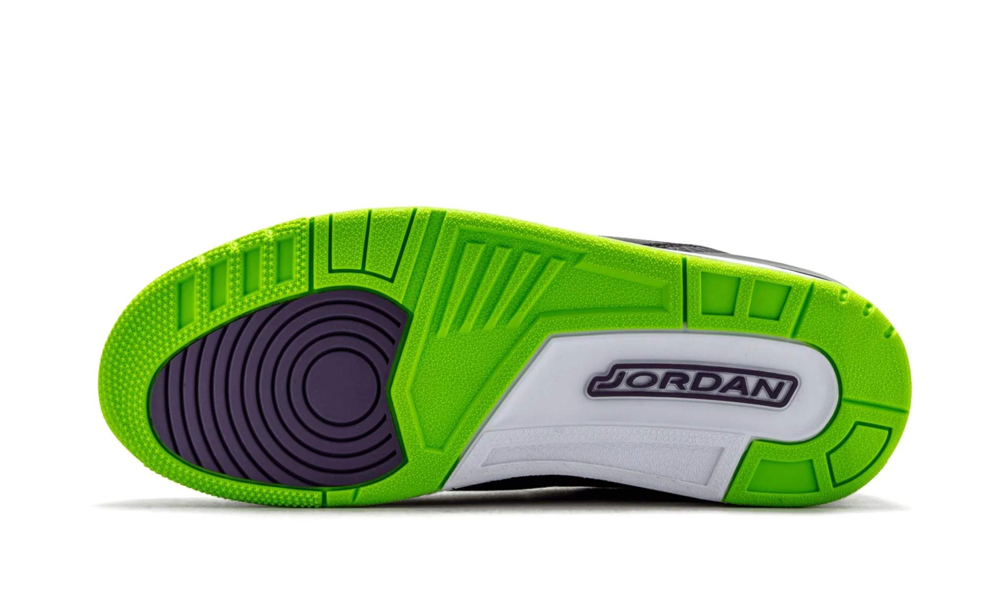 Supplied by a premier sneaker marketplace dealing with unworn, already sold out, in demand rarities. Each product is rigorously inspected by experienced experts guaranteeing authenticity. Due to its similarities in colour to the famous foe of Batman, this Air Jordan 3 in black, green, and purple quickly picked up the “Joker” nickname. Featuring a pebbled leather texture, an ankle length, a brand embossed tongue, a lace-up front fastening, a round toe and a flat rubber sole.
