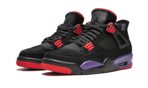 The Air Jordan 4 Retro NRG ‘Raptors’ shares its name with an OG colorway of the Air Jordan 7, and both feature nubuck construction and a black, red and purple palette. The 4 differs from the 7 by ditching the charcoal grey paneling of the 1992 release while also adding a speckled midsole. But it’s not as if the ‘Raptors’ name is exactly canonical—the Toronto Raptors franchise didn’t exist before 1995.