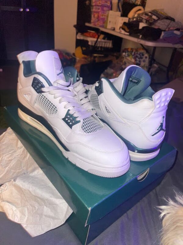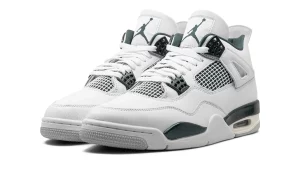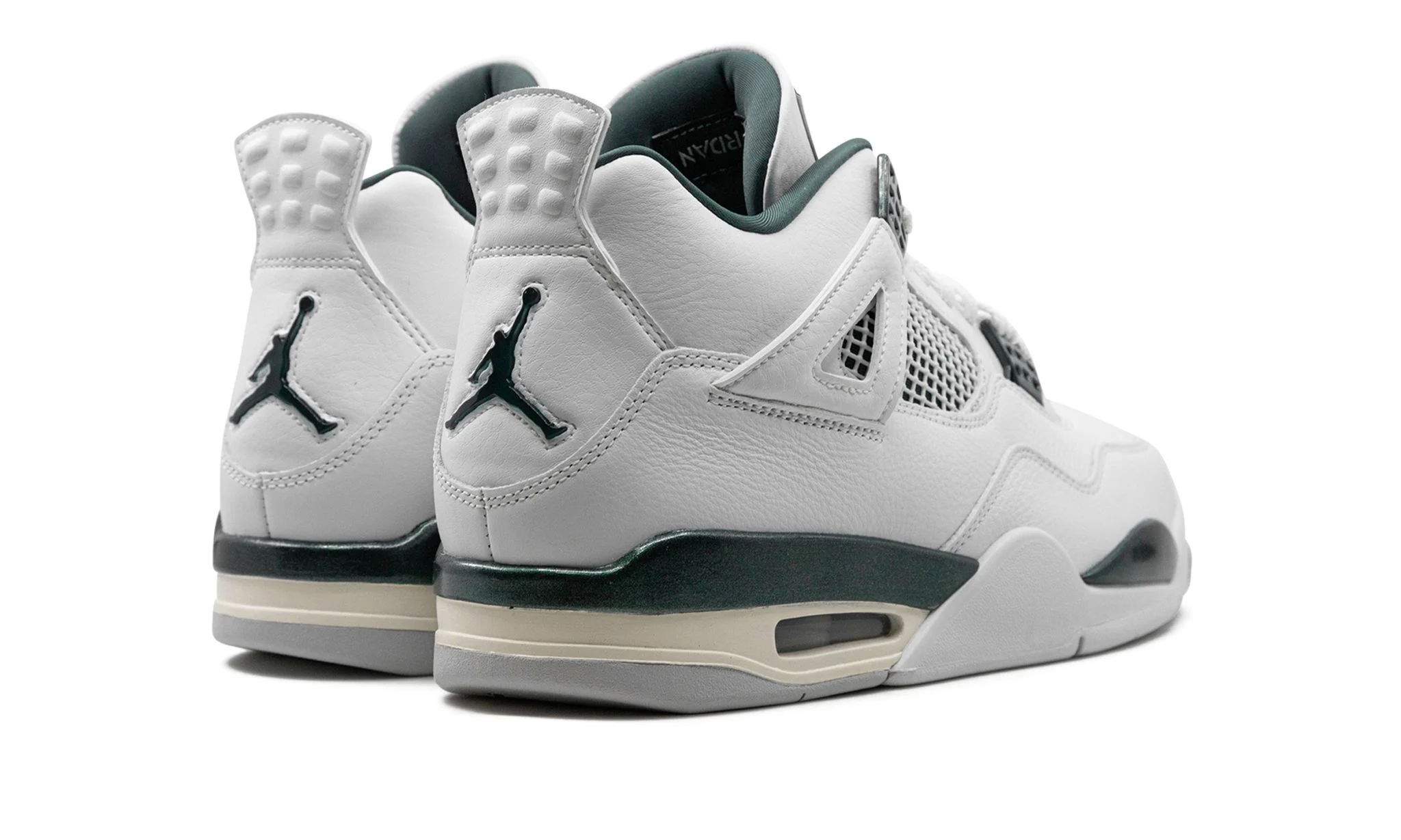 The Air Jordan 4 Retro 'Oxidized Green' revives a distinctive colorway from 1999, updated with premium materials and craftsmanship. Featuring a clean white leather upper, the shoe is accented with touches of oxidized green on the eyelets, Jumpman logo on the tongue, and outsole. Mesh panels on the sides enhance breathability, while the iconic wings on the sides and visible Air-Sole unit in the heel provide comfort and cushioning. Completing the design is a translucent outsole that offers traction and durability. The Air Jordan 4 Retro 'Oxidized Green' blends retro style with contemporary details, making it a sought-after addition for sneaker collectors and fans of Jordan Brand footwear.