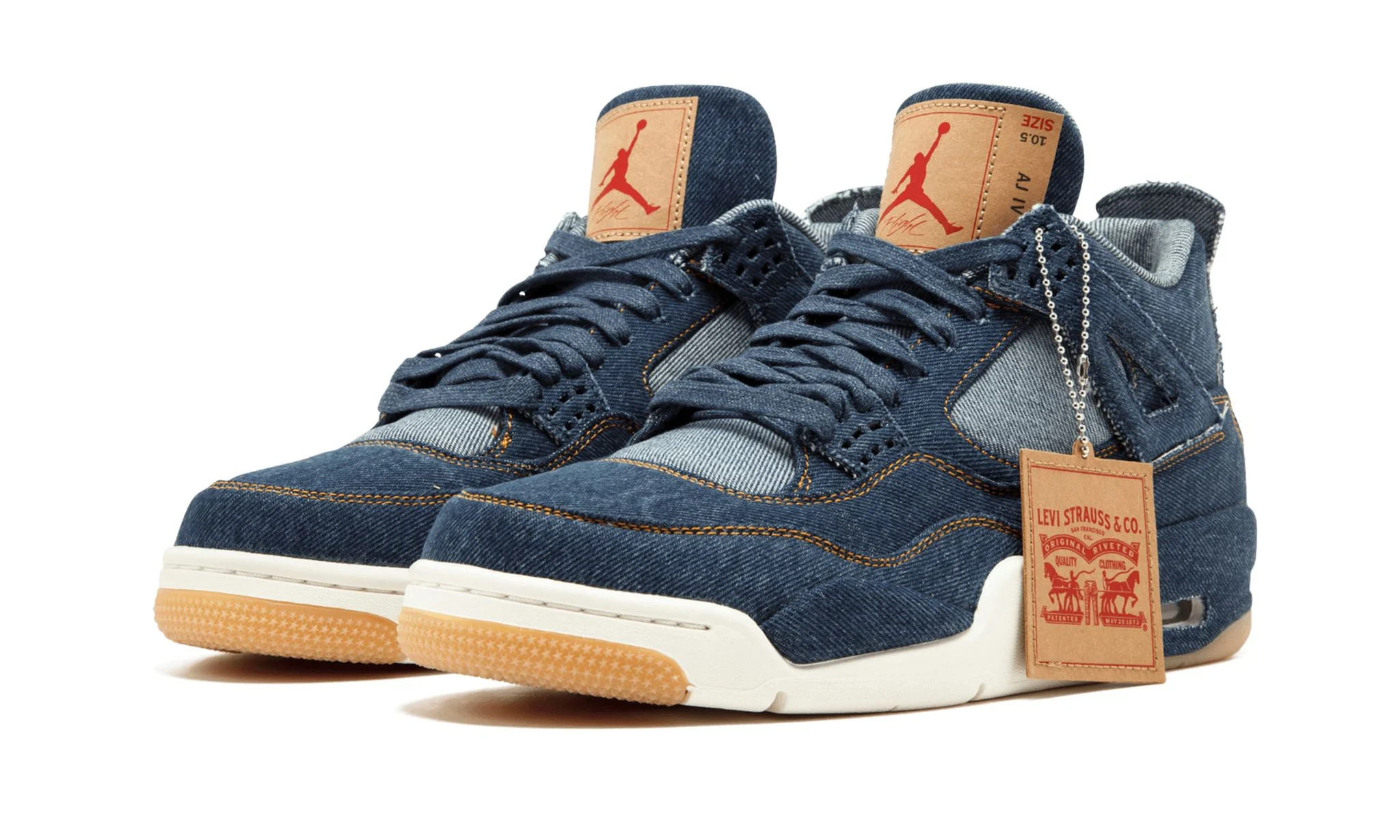 The Air Jordan 4 Retro x Levi's 'Denim' is a collaborative masterpiece between Jordan Brand and Levi Strauss & Co., released in 2018. This edition features a premium denim upper in a classic blue denim wash, showcasing Levi's craftsmanship and heritage. The shoe is detailed with Levi's signature red tab on the quarter panel, complemented by Jumpman branding on the tongue and heel. Metal eyelets and contrasting stitching enhance the rugged yet stylish aesthetic, while a white midsole with visible Air-Sole units provides cushioned comfort. The design is completed with a gum rubber outsole for traction and durability. The Air Jordan 4 Retro x Levi's 'Denim' merges iconic denim styling with the timeless Air Jordan 4 silhouette, appealing to collectors and enthusiasts alike for its unique blend of fashion and sportswear heritage.