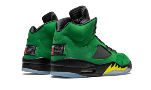 The Air Jordan 5 “Oregon” honors the Oregon Ducks as Jordan Brand celebrates the 30th anniversary of Michael Jordan’s legendary fifth signature shoe in 2020. Devoid of any Ducks branding, the colorway nonetheless graciously employs the school’s familiar green, yellow, and black color scheme. Save for the smoky translucent netting found on the mid-panel and tongue, the entire upper is cast in green suede for a bold and unique appearance. Additional styling includes black laces, a semi-translucent lace lock with Jumpman detailing, and embroidered “Team Jordan” patch on the heel. The black leather tongue displays a tonal embossed Jumpman logo and the black rubber midsole features yellow accented shark tooth detailing on top of an icy blue translucent outsole.