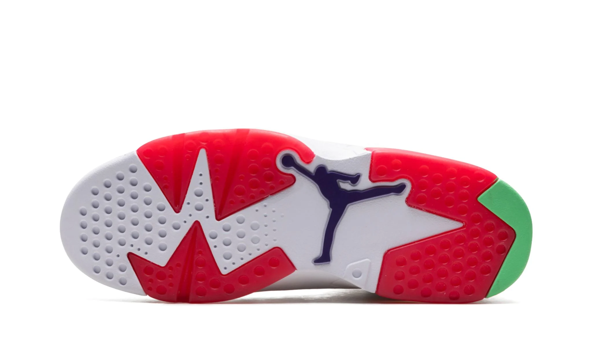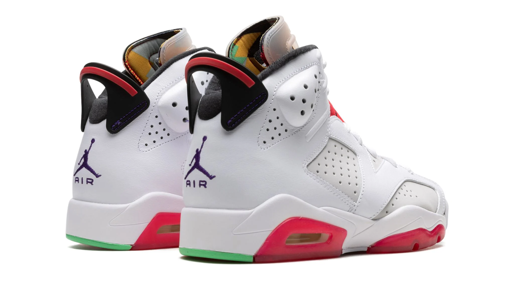 The Air Jordan 6 “Hare” is a Spring 2020 release that features overtures to another classic Jordan shoe: the original Air Jordan 7 “Hare.” Famously appearing on the feet of Bugs Bunny during the early ‘90s television commercials with Michael Jordan, the “Hare” Jordan theme returns with a modern twist as Jordan Brand honors the legacy of “The GOAT’s” sneaker collection. White leather overlays contrast the light grey perforated synthetic nubuck base that appears on the mid-panel and toe. A red neoprene lace cover with a black Jumpman logo sits just below the clear rubber tongue that reveals the multicolor geometric pattern found on the Jordan 7's tongue underneath. An orange and green lace lock that resembles a carrot adds the final special touch for the upper, while red translucent rubber highlights the sole.