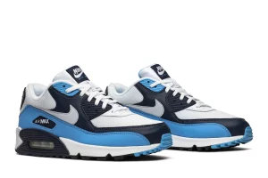 The Air Max 90 'UNC' pays homage to the University of North Carolina with its iconic color scheme and classic design. This edition features a blend of 'University Blue' and 'White', capturing the essence of the Tar Heels' school colors. The upper is crafted from a combination of leather, mesh, and suede, ensuring a premium look and feel. 'University Blue' dominates the mudguard, Swoosh branding, lace eyelets, and heel tab, while 'White' complements on the toe box, midsole, and laces. The signature Air Max unit in the heel provides responsive cushioning, delivering comfort and support for everyday wear. With its timeless colorway and heritage-inspired details, the Air Max 90 'UNC' celebrates both sneaker culture and collegiate tradition, making it a sought-after addition to any sneaker collection.