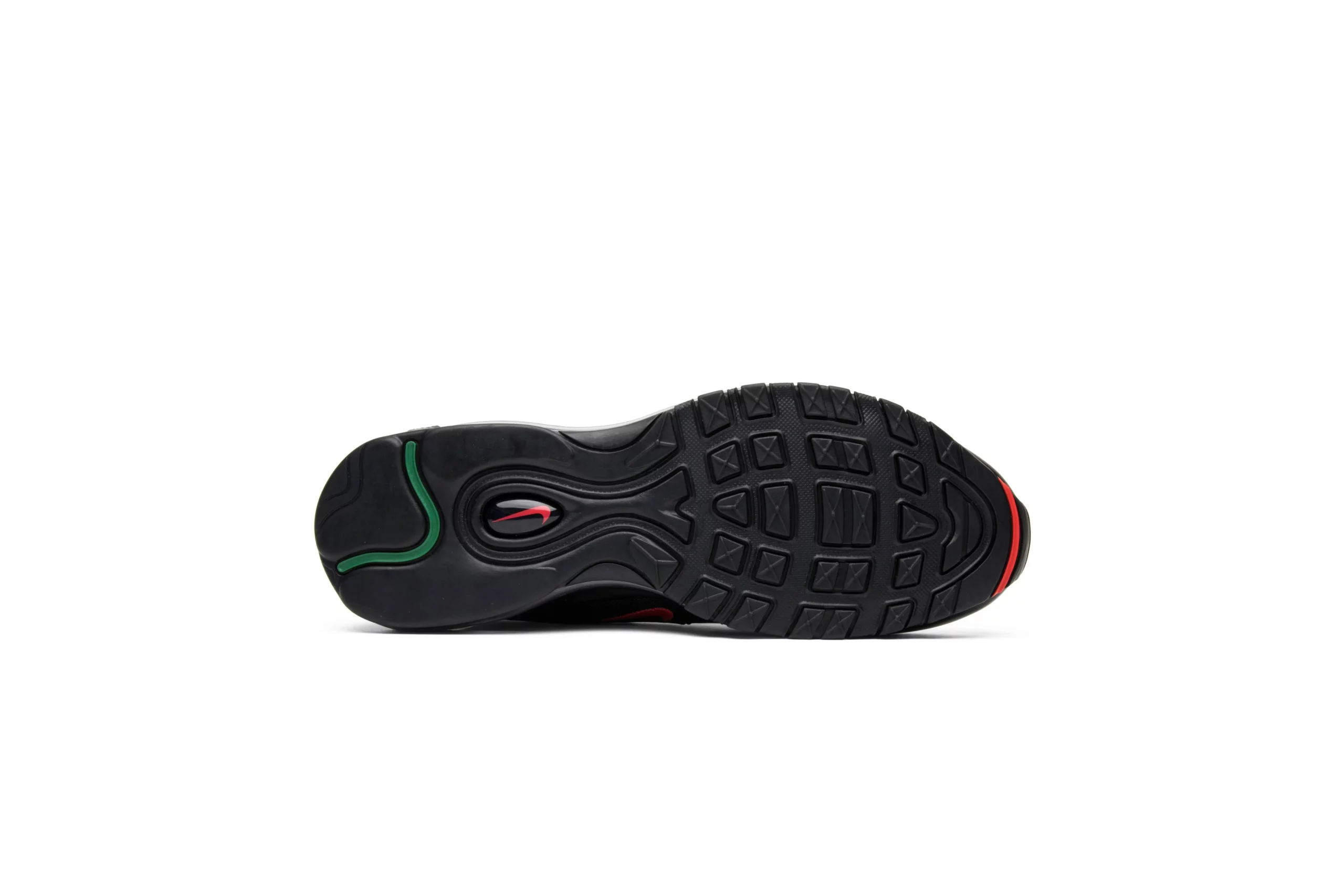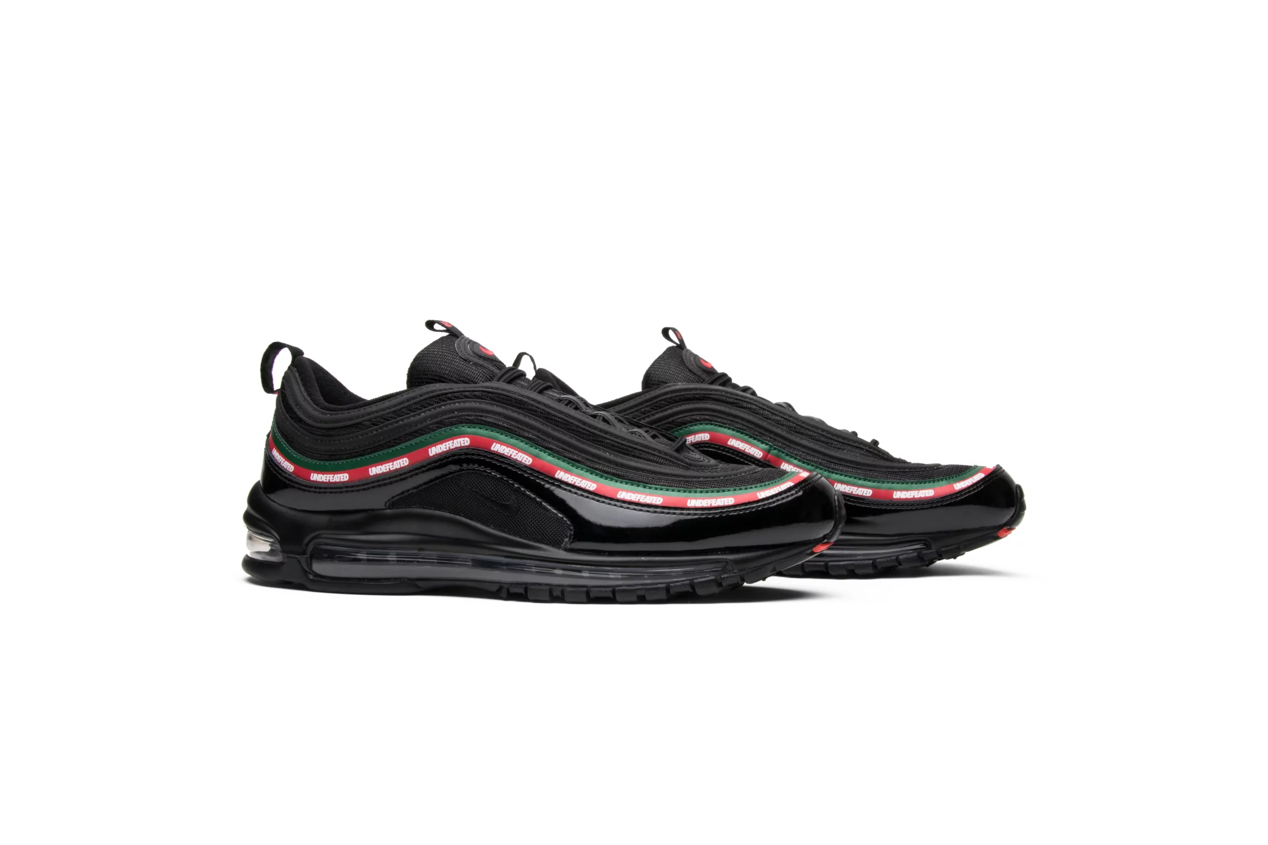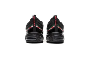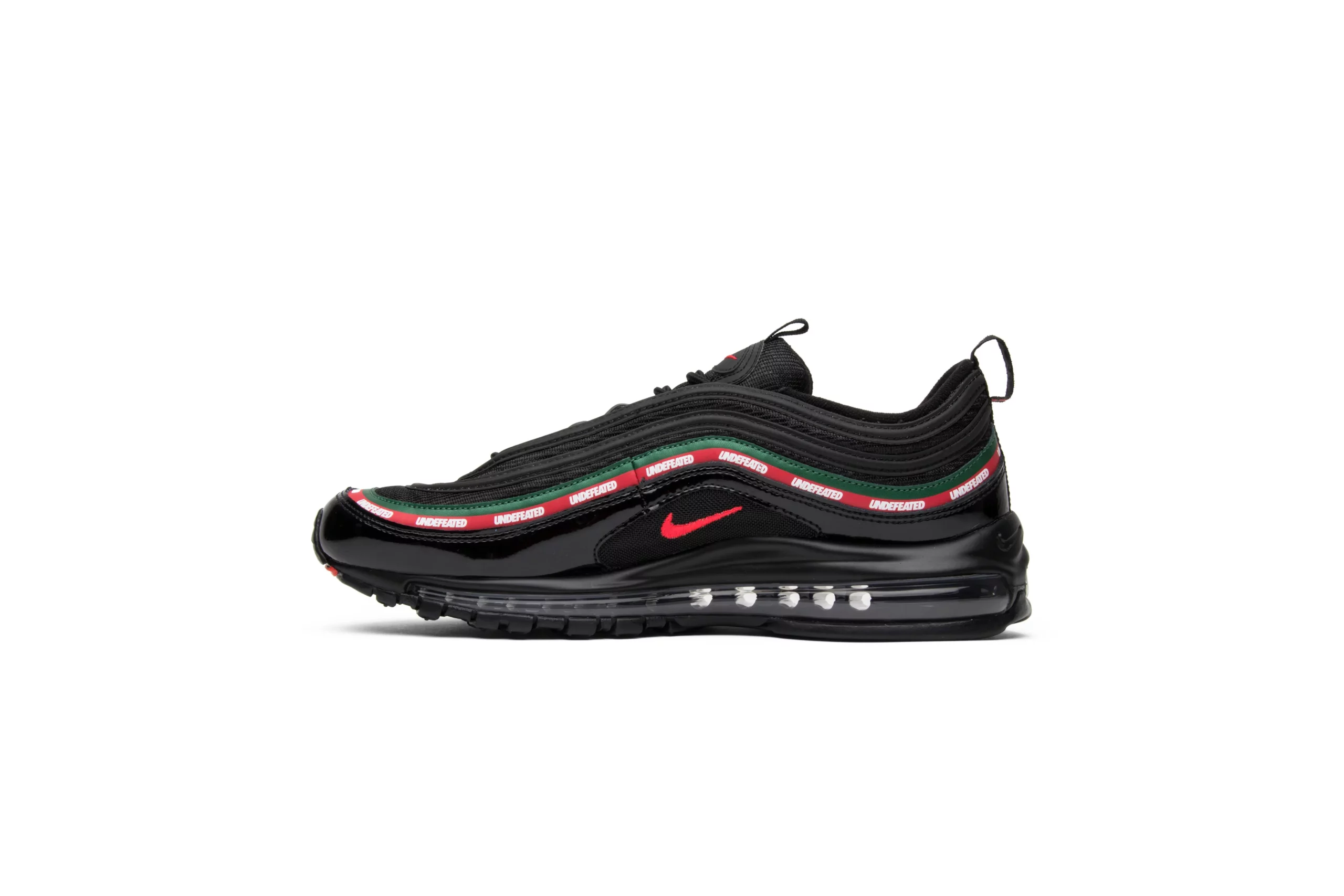The Air Max 97 OG x UNDEFEATED 'Black' is a collaboration that merges Nike's iconic Air Max 97 silhouette with UNDEFEATED's distinct streetwear aesthetic. This edition showcases a sleek and stealthy design, featuring a predominantly black upper constructed from premium materials like leather and mesh. The signature wavy lines of the Air Max 97 are accentuated with reflective piping, adding a touch of visibility in low light. UNDEFEATED's branding is boldly displayed with their logo appearing on the lateral side near the heel tab. Completing the look is a contrasting white midsole with a full-length Air Max unit for responsive cushioning and comfort. This collaboration exemplifies the fusion of sportswear innovation and urban style, making the Air Max 97 OG x UNDEFEATED 'Black' a coveted piece among sneaker enthusiasts and collectors alike.