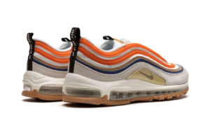 he Nike Air Max 97 “Frank Rudy” is a colorway of the retro running and lifestyle shoe that celebrates the life of the designer of Nike’s Air technology. Marion “Frank” Rudy is the innovator of Nike’s iconic Air cushioning technology and, on the Air Max 97, the brand celebrates Rudy’s accomplishments. The shoe features a white mesh upper with fiery orange leather overlays matched with tan and navy overlays. A grey suede mudguard and a tan overlay with a small black Swoosh on the sides adds to the look. An air pressure barometer hangtag nods to the former aerospace engineer’s achievements.