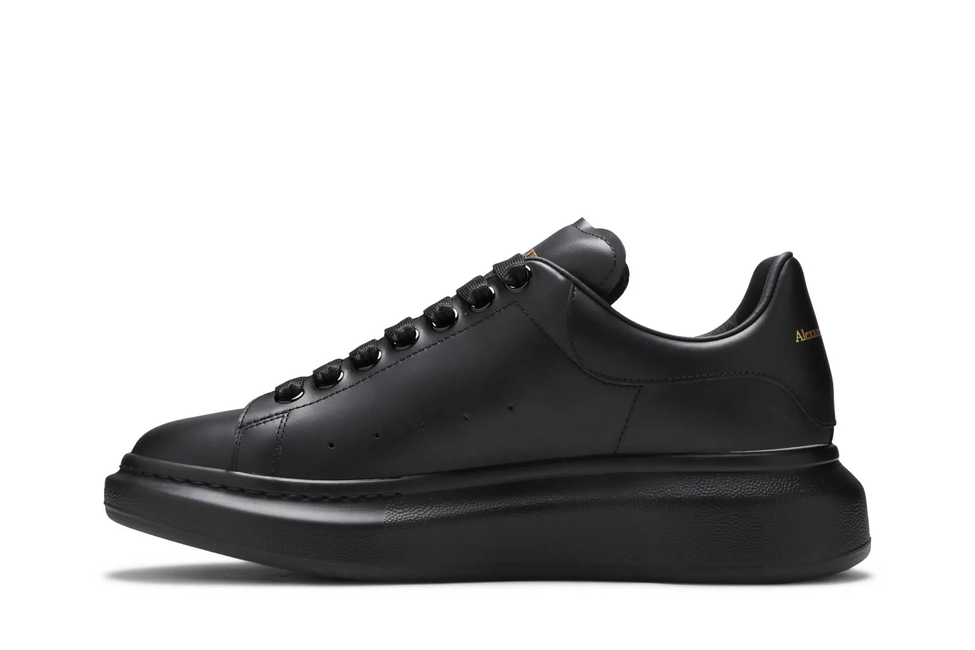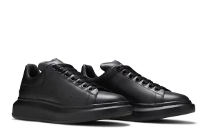 The Alexander McQueen Oversized Sneaker in 'Black' epitomizes modern luxury and urban sophistication. Crafted with meticulous attention to detail, this iconic sneaker features a sleek and streamlined silhouette crafted from premium black leather. The minimalist design is accentuated by the exaggerated platform sole, which not only adds a bold statement but also ensures comfort and durability. Subtle branding includes the Alexander McQueen logo embossed on the tongue and a contrasting white leather heel tab, enhancing its understated yet unmistakable identity. Versatile enough to complement both casual and semi-formal attire, the 'Black' Oversized Sneaker exudes effortless elegance and contemporary style, making it a timeless staple in any fashion-forward wardrobe.