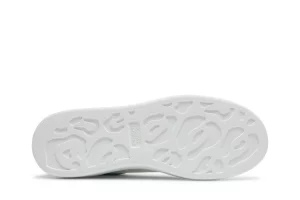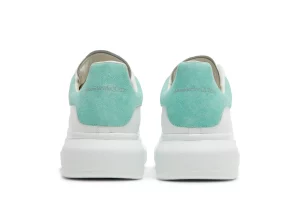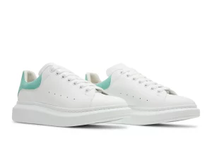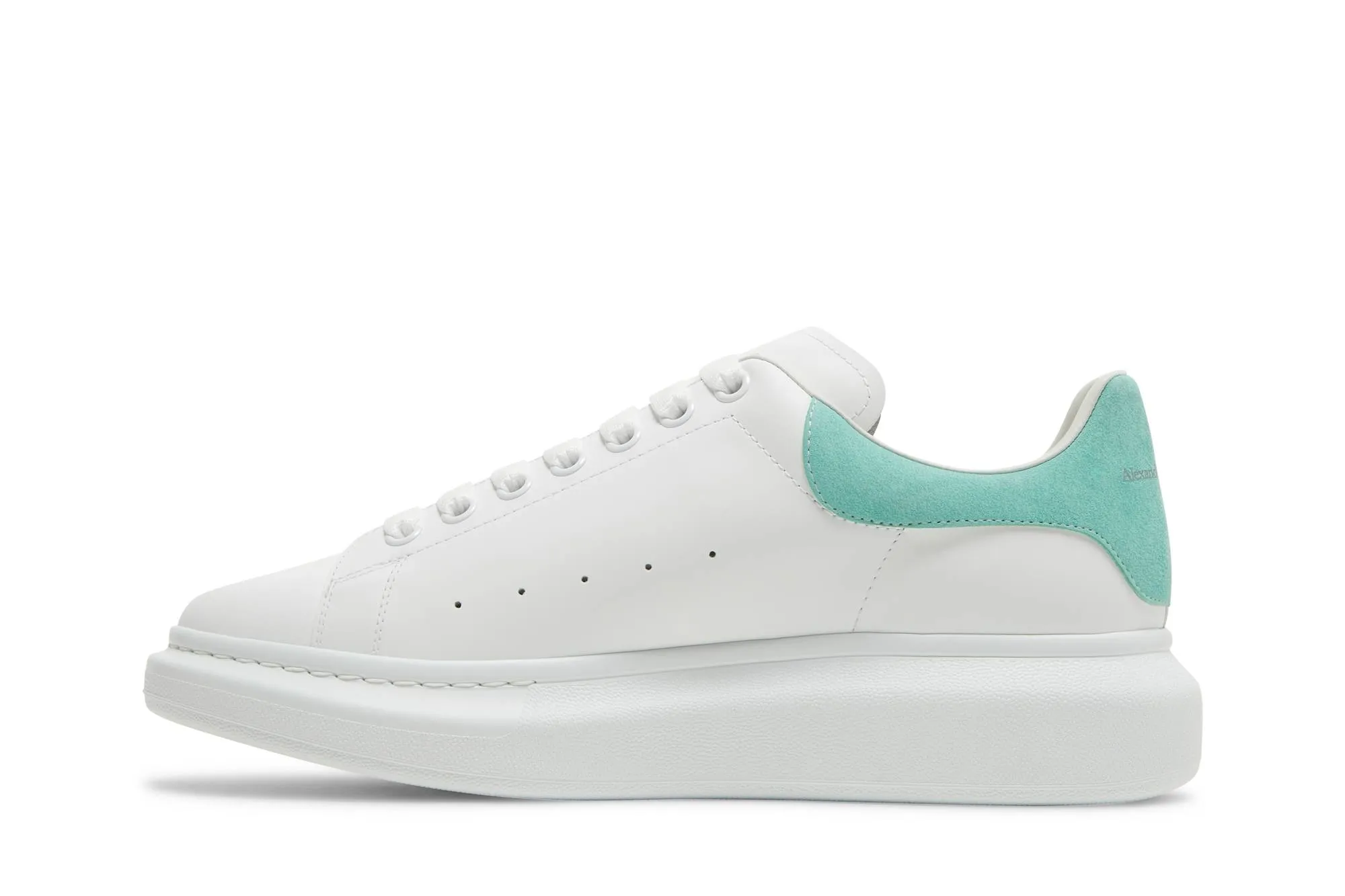 The Alexander McQueen Oversized Sneaker in 'White Teal' merges classic sophistication with a refreshing pop of color. Crafted from smooth white leather, these sneakers feature accents in a vibrant teal shade, adding a modern and dynamic element to their design. The exaggerated rubber sole not only enhances comfort but also makes a bold fashion statement. With minimal branding and a lace-up closure, they maintain a sleek and versatile aesthetic suitable for both casual and more polished looks. These sneakers embody Alexander McQueen's distinctive style, combining luxury craftsmanship with contemporary urban appeal.
