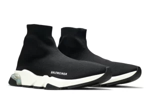 The Balenciaga Speed Sneaker with a 'Clear Sole - Black' design is a bold reinterpretation of urban footwear. These sneakers boast a sleek silhouette crafted from a stretchy knit material that contours to the foot for a snug, sock-like fit. The innovative clear sole adds a modern twist to the classic black colorway, creating a striking visual contrast that catches the eye. With the iconic Balenciaga logo subtly integrated into the design, these sneakers exude a sense of contemporary luxury. Whether worn for athletic endeavors or as a fashion statement, the Balenciaga Speed Sneaker 'Clear Sole - Black' offers a perfect blend of style and functionality, making it a standout choice for the modern individual.