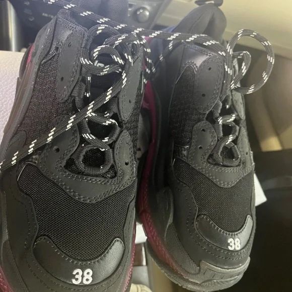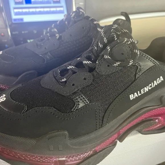 The Balenciaga Triple S Sneaker 'Clear Sole - Black Pink Neon' redefines contemporary footwear with its bold color palette and distinctive design. Featuring a sleek black upper adorned with vibrant pink and neon accents, these sneakers make a striking statement wherever you go. The iconic triple-stacked sole, now with a translucent finish, adds a modern twist to the classic silhouette while providing exceptional cushioning and support. Crafted from premium materials, including leather and mesh, these sneakers offer both durability and style. The attention to detail is evident in the intricate stitching and layered construction, creating a dynamic and textured look. Whether paired with casual streetwear or dressed up with tailored separates, the Balenciaga Triple S Sneaker 'Clear Sole - Black Pink Neon' is sure to turn heads and elevate any outfit with its edgy yet effortlessly cool vibe.