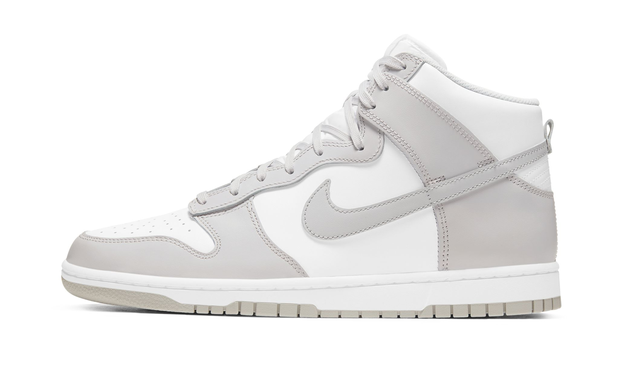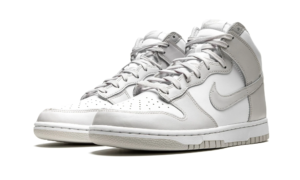 White/grey leather/rubber SB Dunk High sneakers from NIKE featuring round toe, flat rubber sole, front lace-up fastening, branded insole, signature Swoosh logo detail and ankle-length. These styles are supplied by a premium sneaker marketplace. Stocking only the most sought-after footwear, they source and curate some of the most hard to find sneakers from around the world.