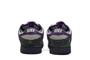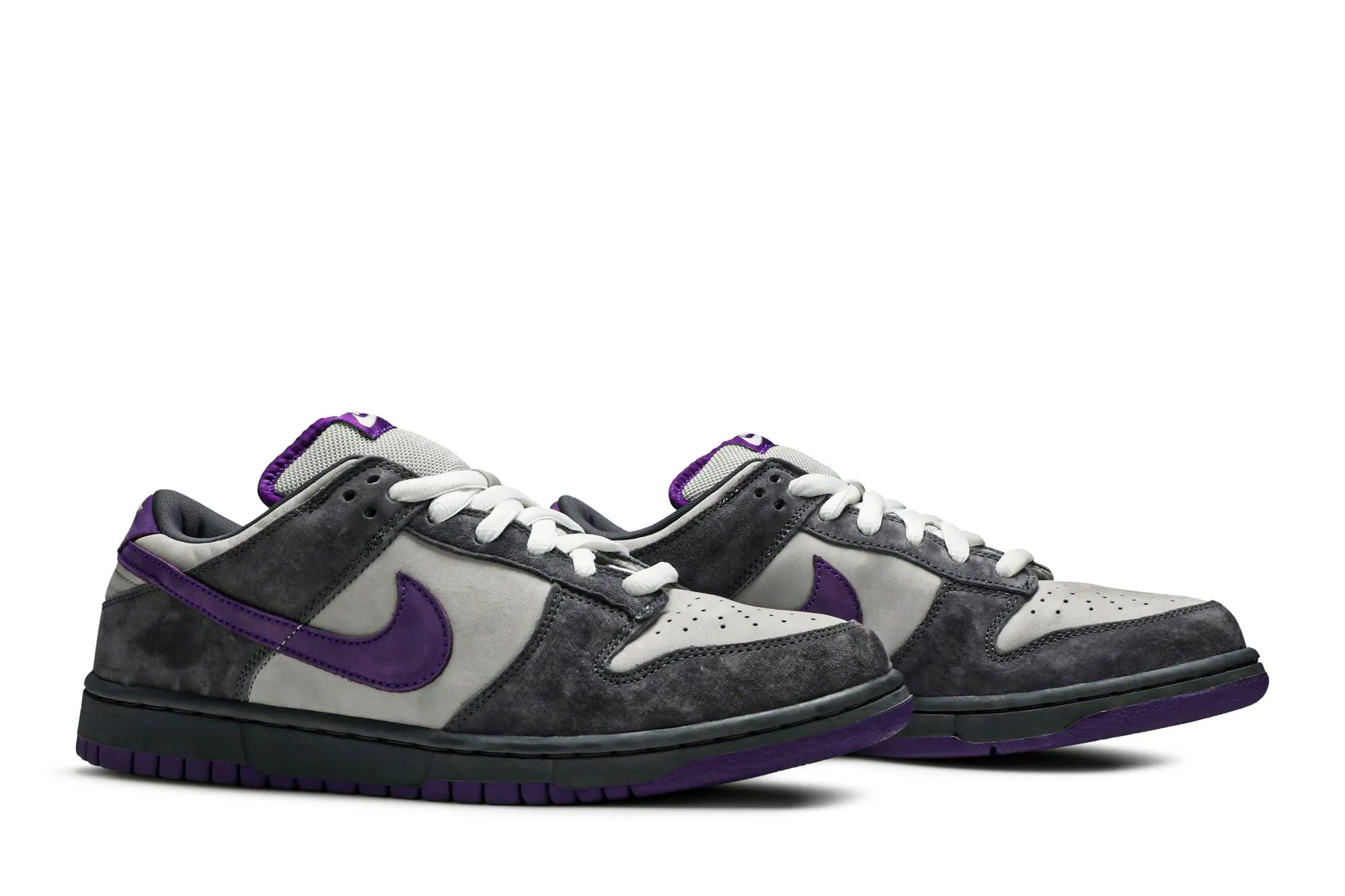 The Dunk Low Pro SB 'Purple Pigeon' is a revered addition to Nike's SB Dunk lineup, known for its distinctive colorway and premium materials. Featuring a rich combination of shades, the upper blends deep purple suede with contrasting accents of black and grey. This color palette is inspired by the original 'Pigeon' Dunk, a highly sought-after release in the SB Dunk series. The shoe maintains the classic Dunk silhouette, offering a padded tongue and Zoom Air unit for comfort and impact protection, ideal for skateboarding. With its unique color scheme and nod to sneaker culture history, the Dunk Low Pro SB 'Purple Pigeon' remains a coveted choice among sneaker collectors and enthusiasts alike.