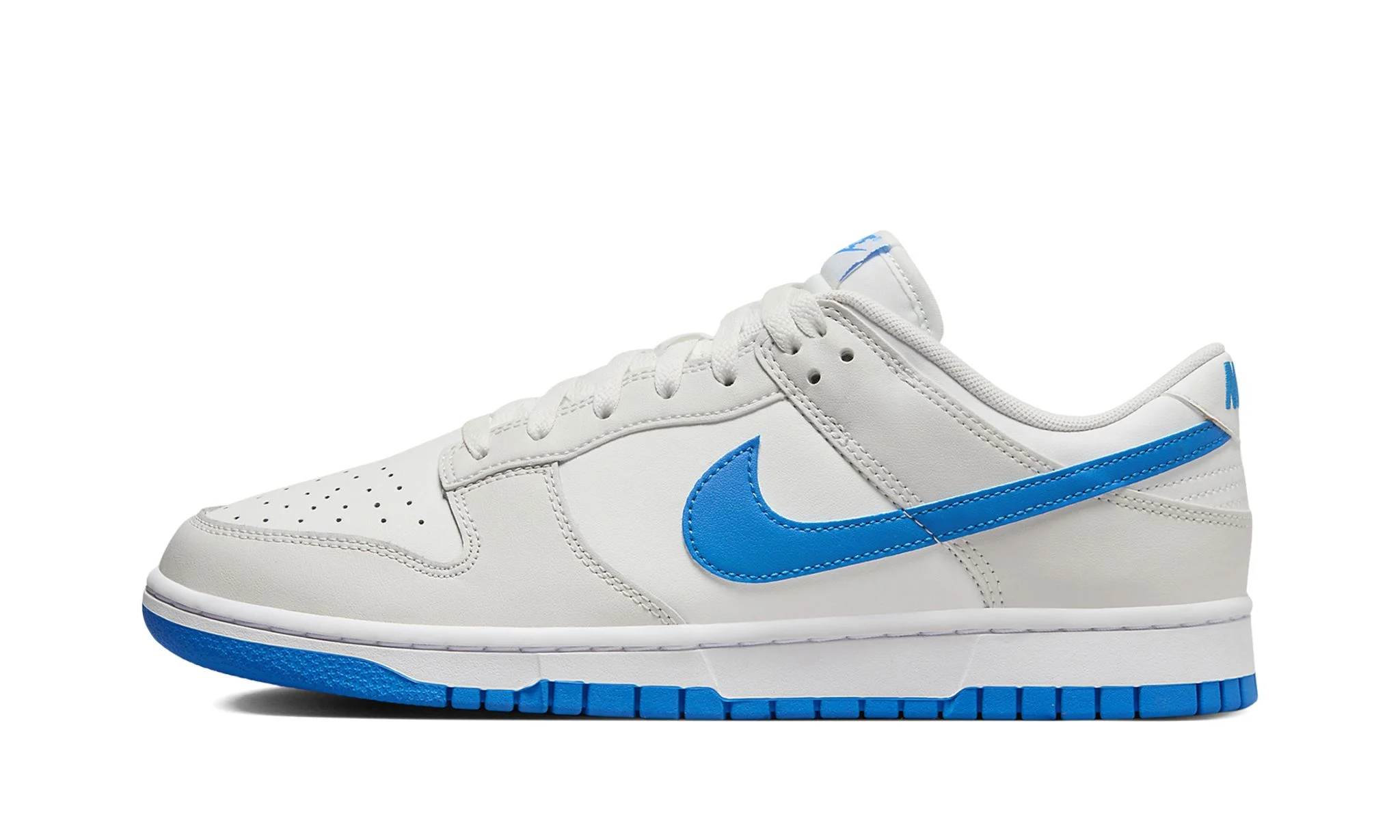 The Nike Dunk Low “Photo Blue” is a clean, ultra wearable colorway of the retro basketball shoe. The upper features a white leather base and Platinum Tint leather overlays. A Photo Blue leather Swoosh appears on the sides, while a blue “Nike” logo is embroidered on the heel. More Photo Blue accenting appears on the Nike logo on the tongue tag. Underfoot, a white midsole and blue outsole finish off the look of this easy-wearing Dunk Low.