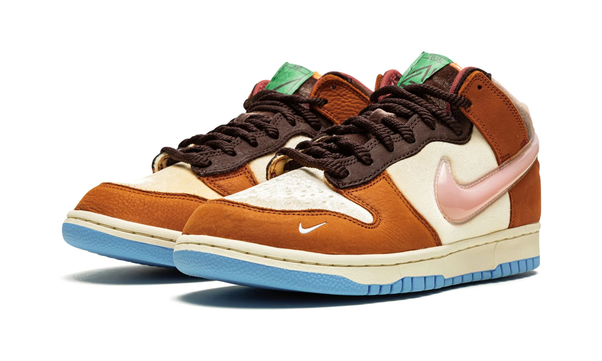 The Social Status x Nike Dunk Low “Chocolate Milk” is a limited edition collaboration between the upscale sneaker and streetwear shop and Nike on the retro basketball shoe from the collective’s “Free Lunch” series. The “Chocolate Milk” is one of several creative Dunk colorways by Social Status that is inspired by federally assisted public school meal programs for kids. The “Chocolate Milk,” as its name suggests, is dedicated to the delicious beverage. Yellow velour appears on the base of the shoe. The overlays are constructed from brown leather and a pink TPU gel Swoosh appears on either side. A list of the shoe’s “ingredients” is printed on the medial side of the shoe while the expiration date appears on the inner collar. A cream-colored midsole and blue rubber outsole complete the look.