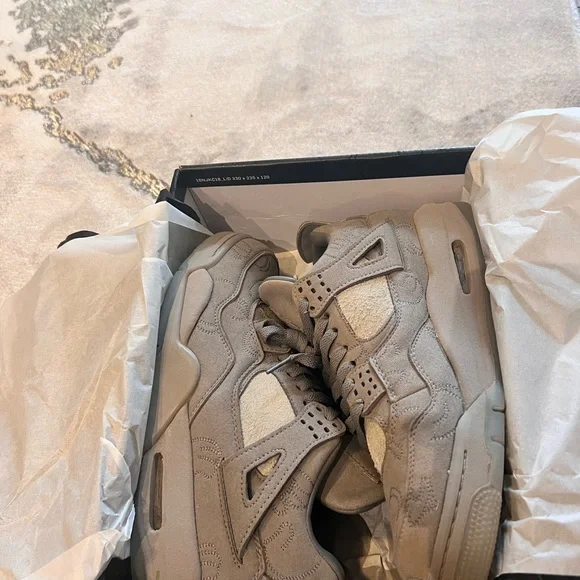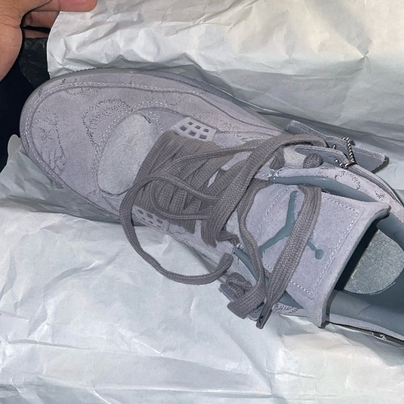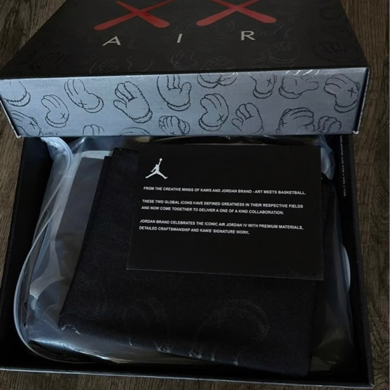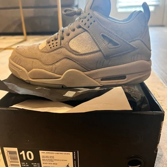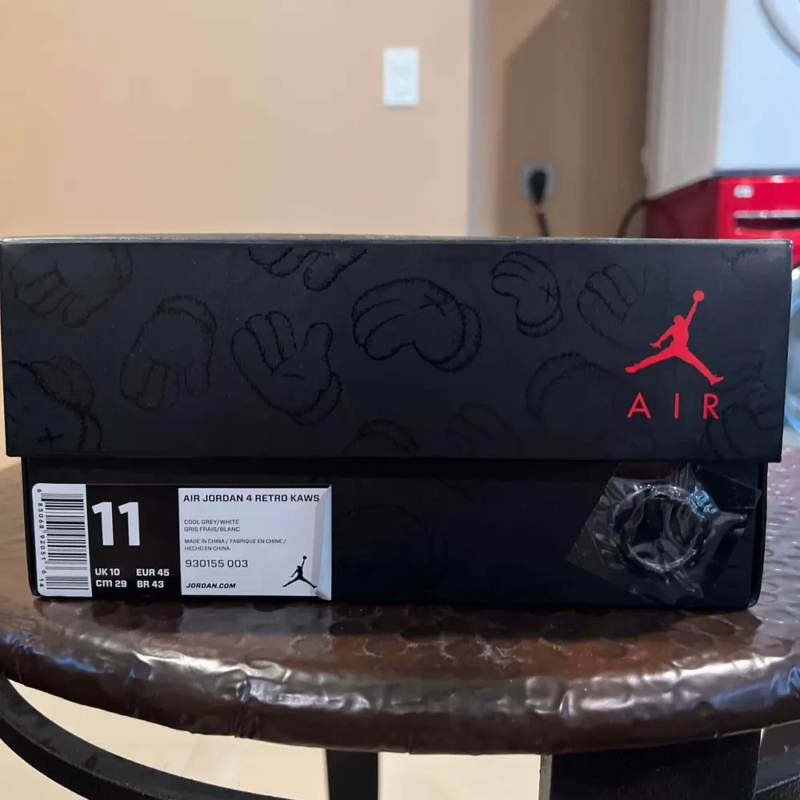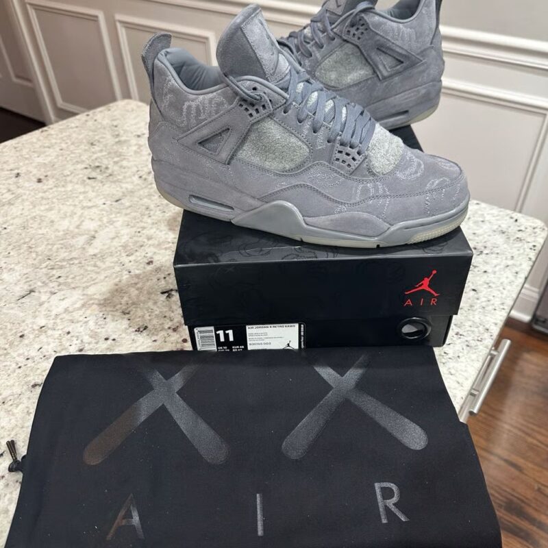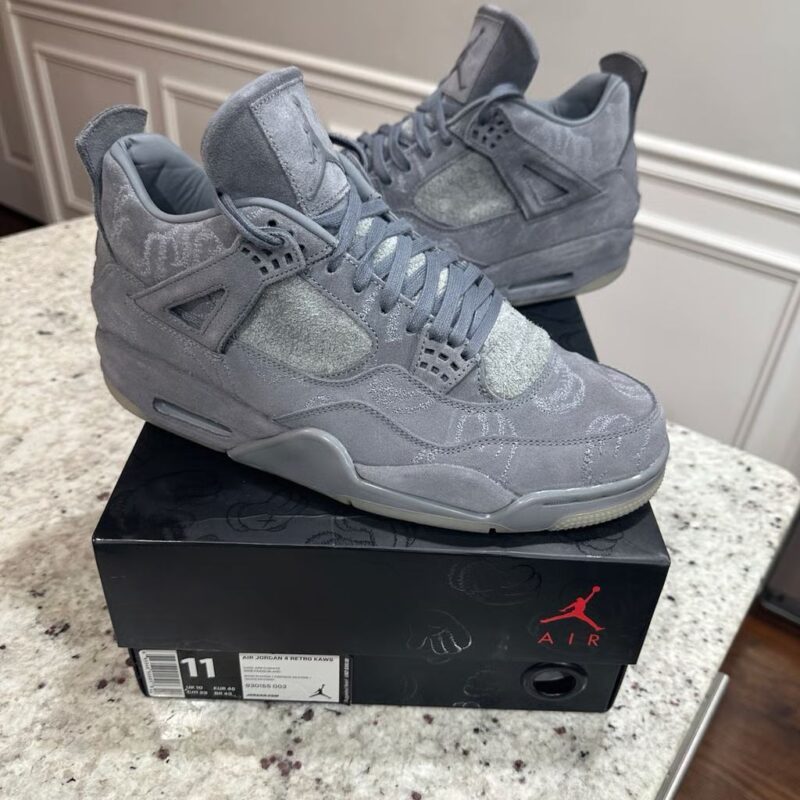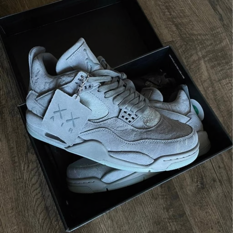 The KAWS x Air Jordan 4 Retro 'Cool Grey' is a celebrated collaboration between Jordan Brand and the renowned artist KAWS, originally released in 2017. This iteration features a premium cool grey suede upper with intricate stitching and KAWS' iconic 'XX' motif embossed throughout the design. The shoe includes glow-in-the-dark detailing on the outsole, lace tips, and Jumpman logos, enhancing its distinctive look. Leather lining and co-branded insoles add to the luxurious feel, while a translucent outsole with KAWS' artwork visible underneath completes the artistic aesthetic. The KAWS x Air Jordan 4 Retro 'Cool Grey' remains highly coveted among sneaker collectors and fans alike, symbolizing a blend of artistic expression and classic Jordan Brand heritage.