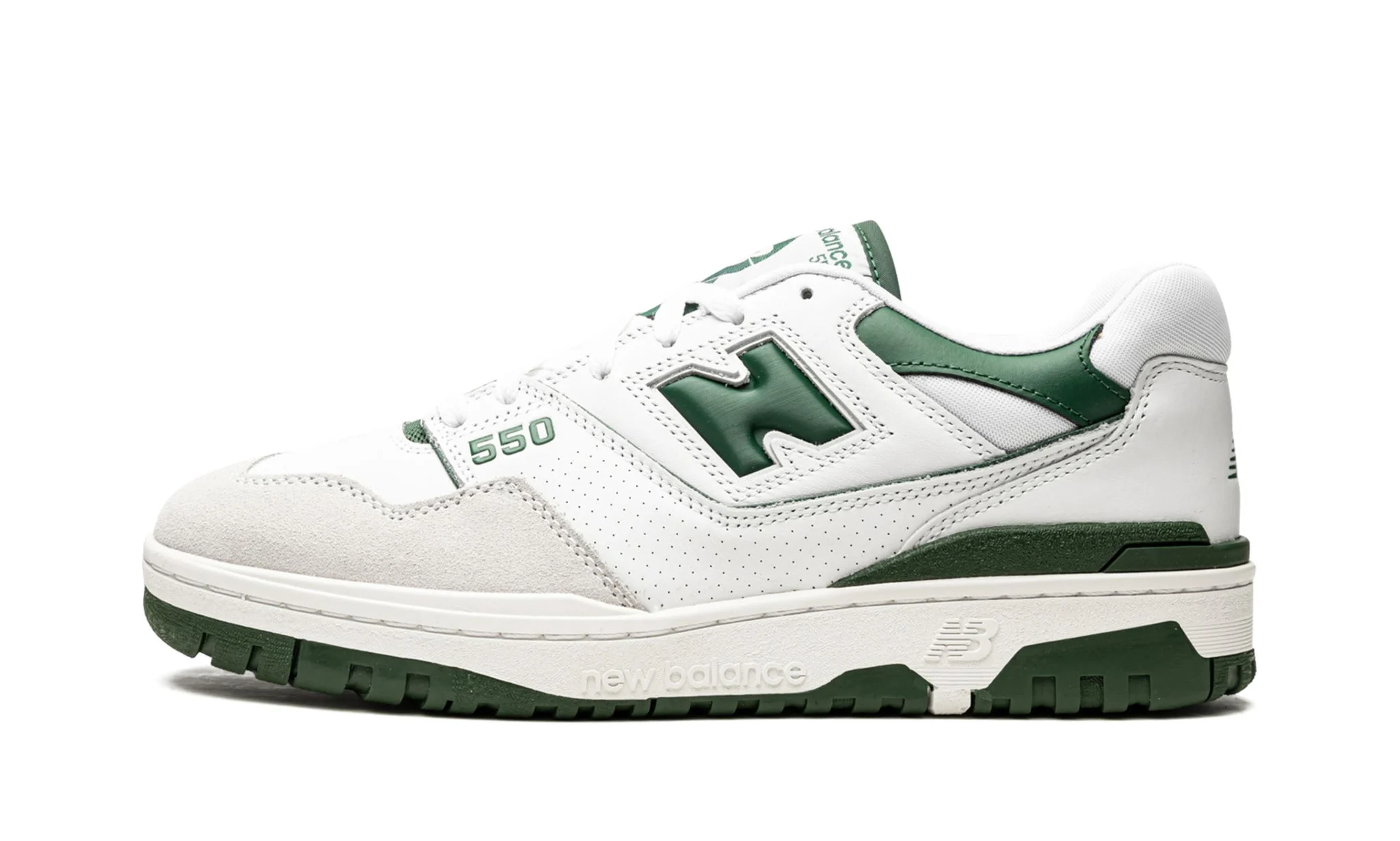 The New Balance 550 “White/Green” is another old-school-inspired colorway of the classic basketball shoe. In the “White/Green” colorway, New Balance gives the popular and timeless 550 model a clean, two-tone, white-and-green color scheme that harkens back to the way vi basketball shoes were designed in the 1980s. The shoe features a white leather upper with a light grey suede overlay on the toe. Dark green leather contrasts the shoe’s mostly white-based design on the leather overlay on the collar, on the “550” branding on the forefoot, and most notably on the “N” logo on the sides. The green hue also appears on the “NB” insignia on the heel and “New Balance 550” graphic on the tongue. Underfoot, a chunky cream rubber midsole and green rubber outsole complete the look.