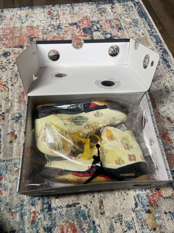 The Off-White x Air Jordan 5 “Sail” is the follow-up to Virgil Abloh’s initial Jordan 5 collaboration from early 2020. Images of the “Sail” colorway surfaced around the same time Off-White and Jordan Brand released the black-based Jordan 5 in February 2020. Like the black version, this design features Abloh’s singular deconstructed aesthetic. The upper displays exposed foam, mesh detailing, and a transparent film with die-cut circles placed randomly on the body and tongue in reference to the Jordan 2010. Off-White’s signature industrial inspired styling is applied throughout, including the Helvetica text on the laces and medial side. Both the embroidered Jumpman on the silver reflective tongue and “23” branding on the heel are finished off in Fire Red as a call back to the original styling of Michael Jordan’s “Player Exclusive” version. Additional nostalgic elements like the “Nike Air” on the heel and pre-yellowed outsole give the shoe a vintage look.