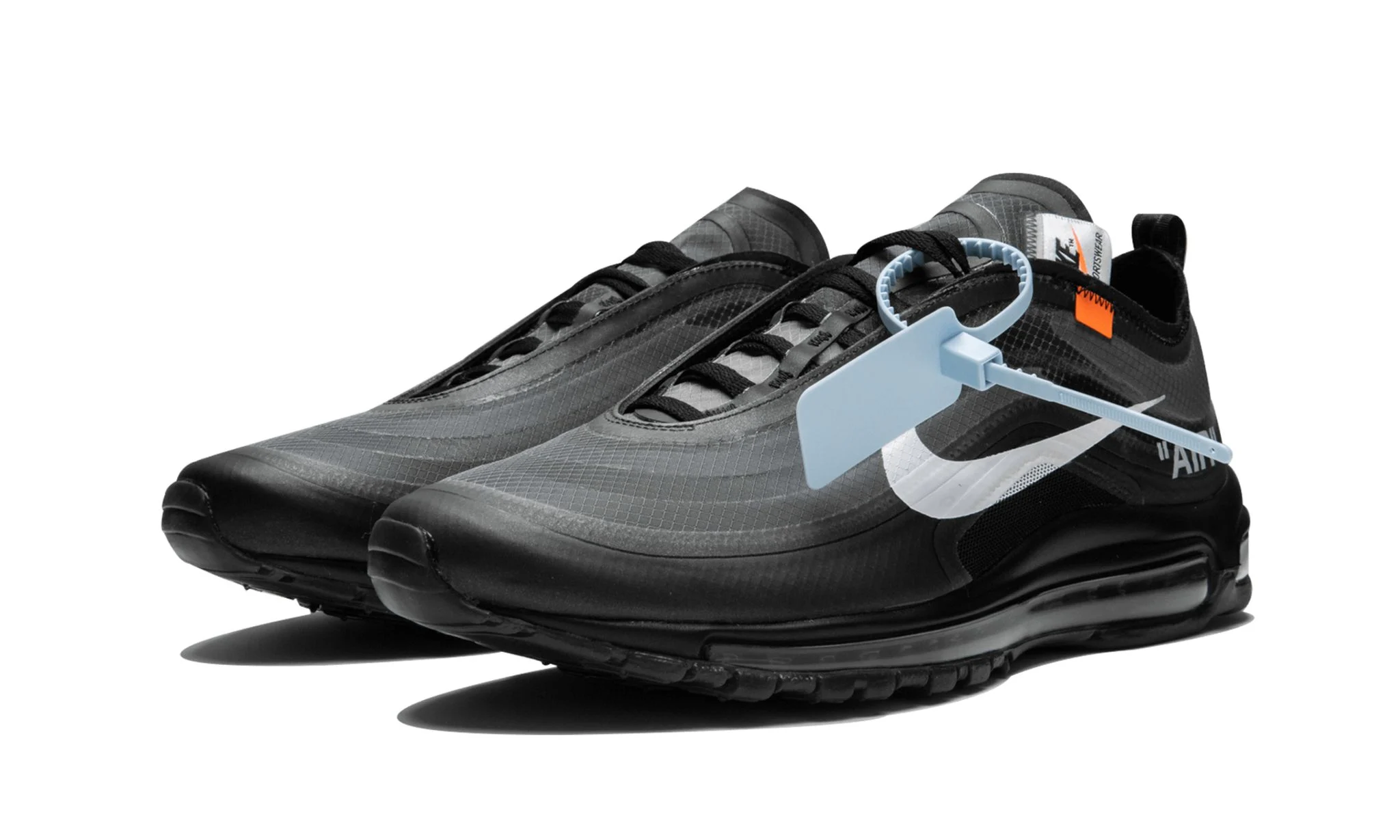 The Off-White x Nike Air Max 97 "Black" is a stealthy edition of the incredibly popular design by Virgil Abloh. Following his first remodel of the classic Air Max model that released within the monumental “The Ten” collection in 2017, this 2018 release basically reverses the original white colorway. The Off-White x Nike Air Max 97 "Black" features a matte black finish across the upper with white Swooshes. All the rest of Abloh’s special detailing seen on other versions of his AM97 are also present, including the bold branding text on the medial side, “AIR” printed on the heel, and a large zip-tie added to the laces.