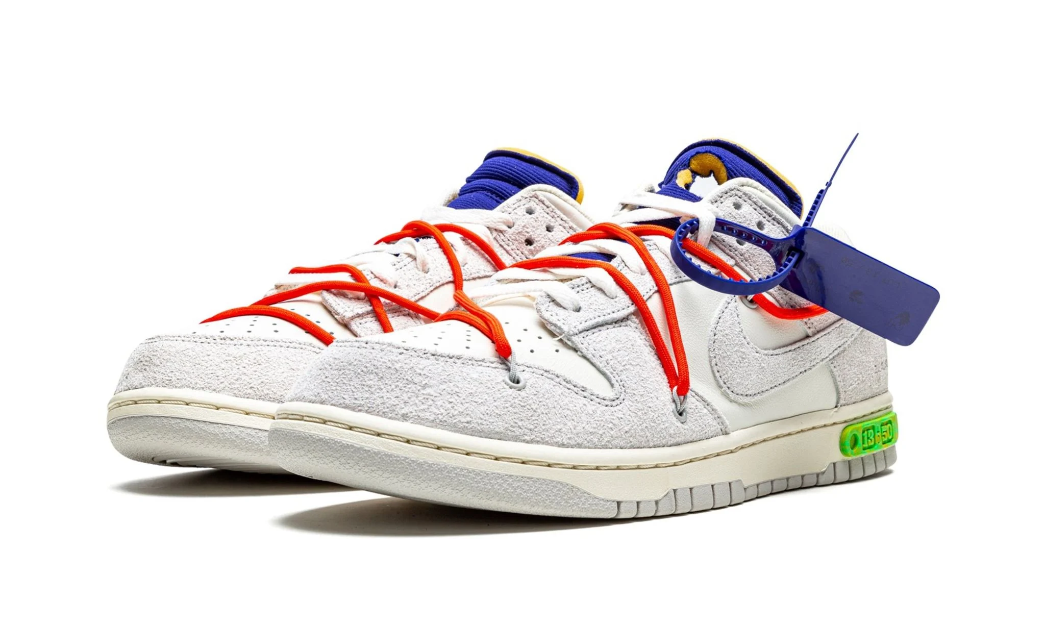 The Nike OFF-WHITE x Dunk Low The 50 NO.13 is the perfect shoe for any casual occasion. Featuring a white leather upper with grey suede overlays, the low-top includes Off White touches, such as the plastic zip tie and Helvetica text. The sneakers also feature a habanero red secondary lacing system, an exposed foam tongue, and a "13 of 50" badge attached on the side midsole. With its clean look and comfortable feel, the Nike OFF-WHITE x Dunk Low The 50 NO.13 is sure to become your new go-to shoe.