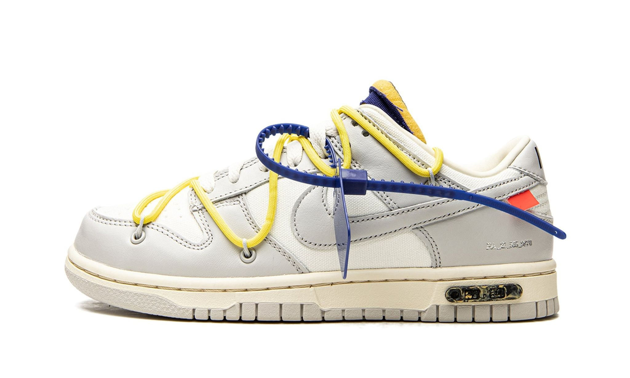 The Nike OFF-WHITE x Dunk Low is a limited edition sneaker from Virgil Abloh's highly anticipated "Dear Summer" collection. This low-top sneaker features a white leather upper with soft grey canvas overlays and Virgil Abloh's signature flourishes, including a plastic zip tie and printed Helvetica text. The Nike OFF-WHITE x Dunk Low is finished with pops of color via the secondary lacing system, zip-tie, exposed-foam tongue, and rectangular tab on the Swoosh. Limited to fifty pairs, this sneaker is a must-have for any Off-White or Nike fan.