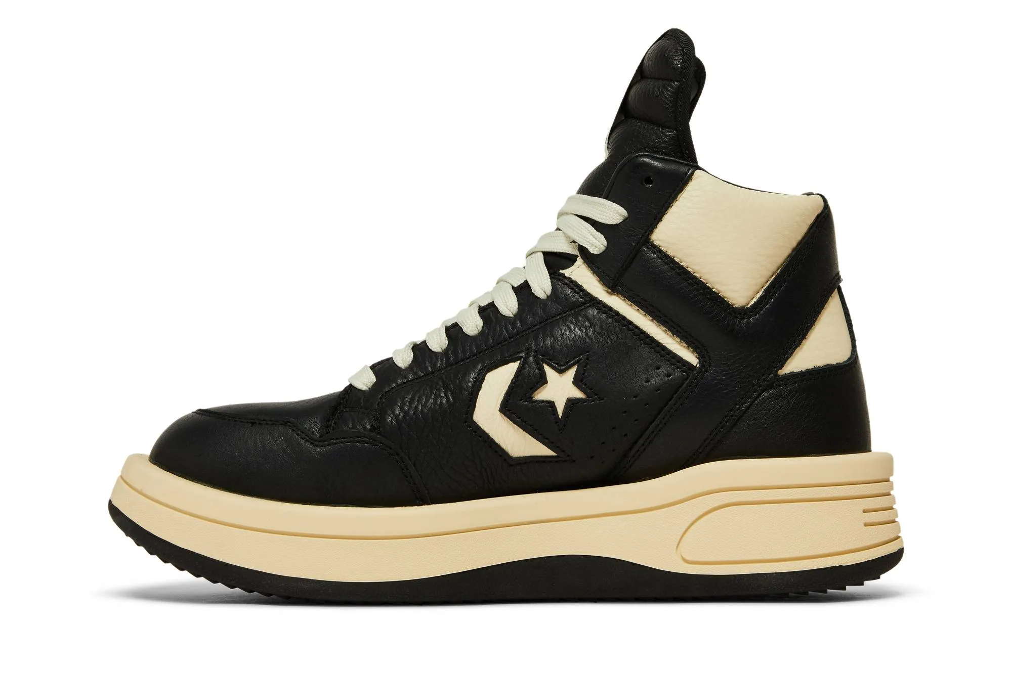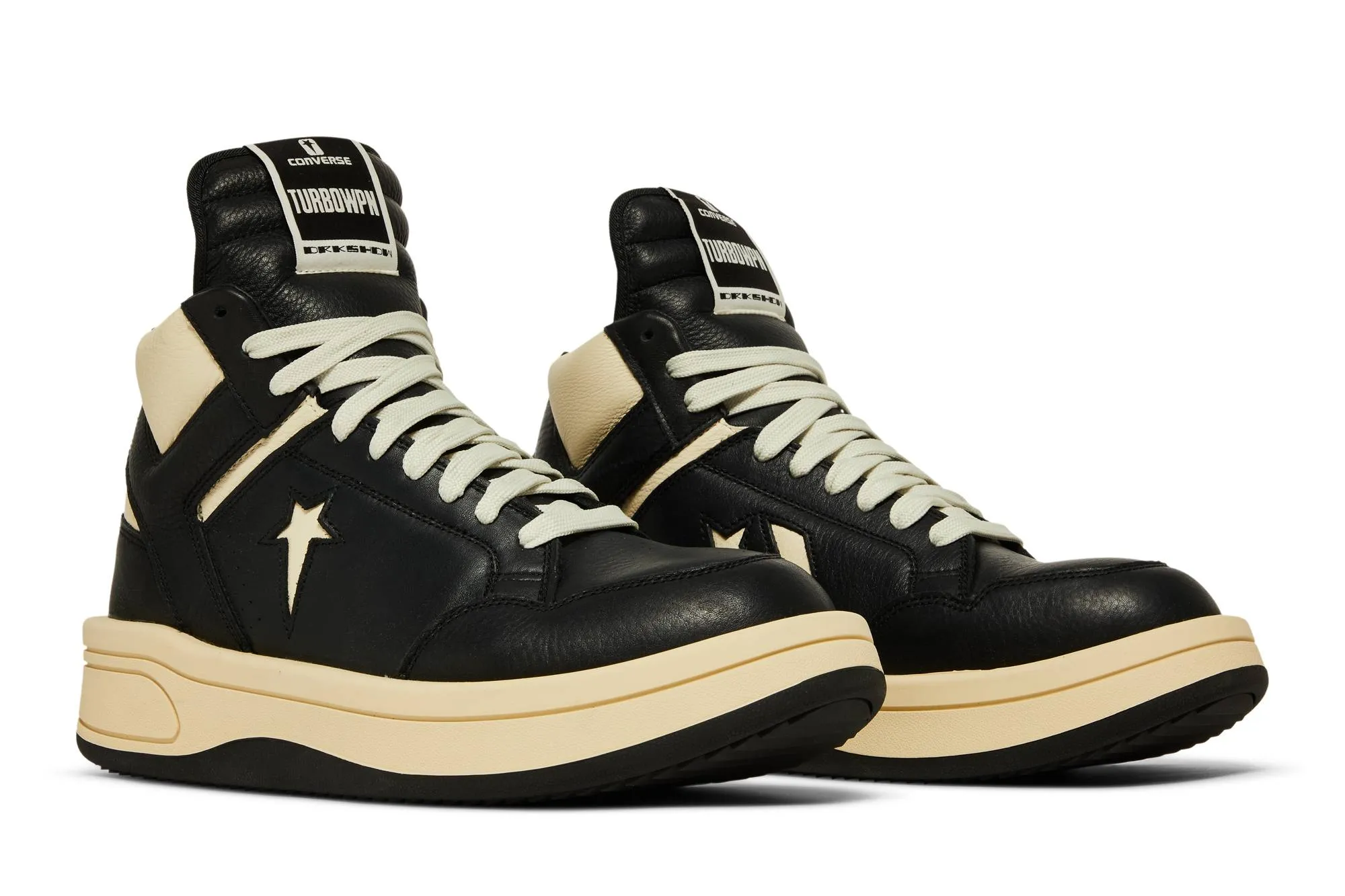 Get the ultimate street style look with the Rick Owens x Converse TURBOWPN Mid Black Cloud Cream sneakers. Designed by the iconic Converse brand, these sneakers feature a sleek black and cream color palette that will complement any outfit. Made with high-quality materials, these sneakers are built to last and provide maximum comfort. Elevate your sneaker game with this collaboration between Rick Owens and Converse. Perfect for any fashion-conscious individual.