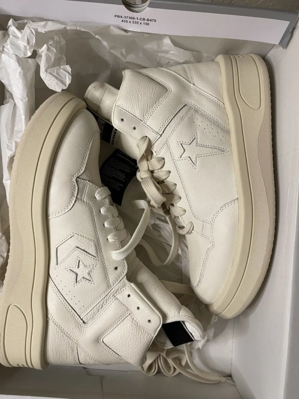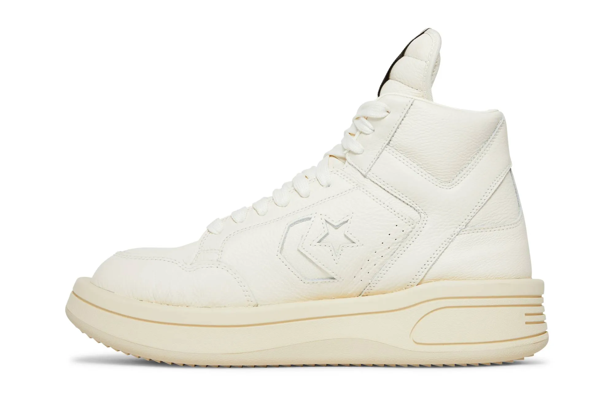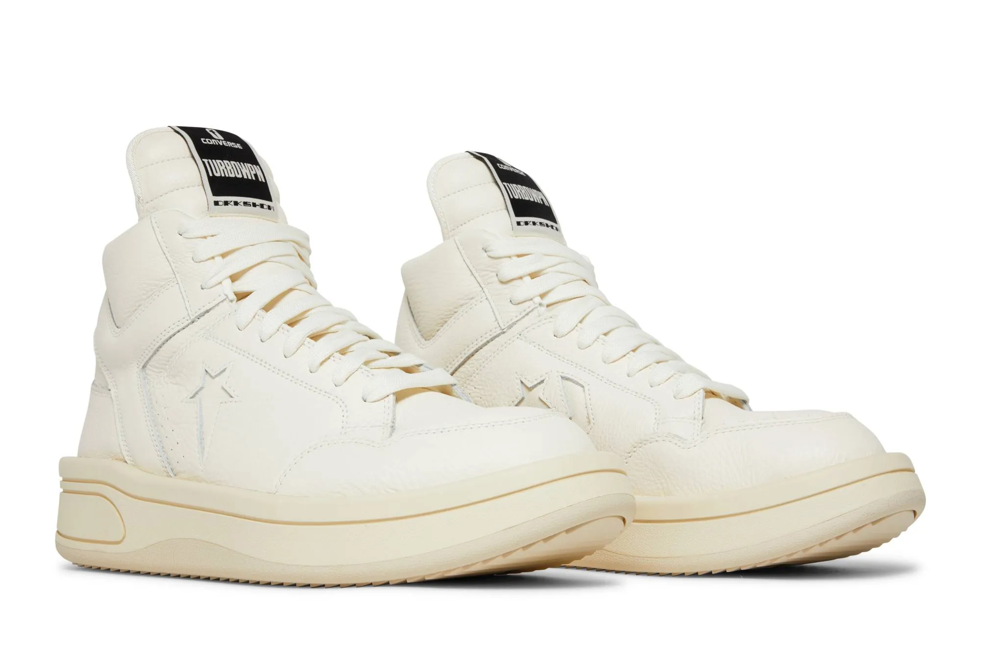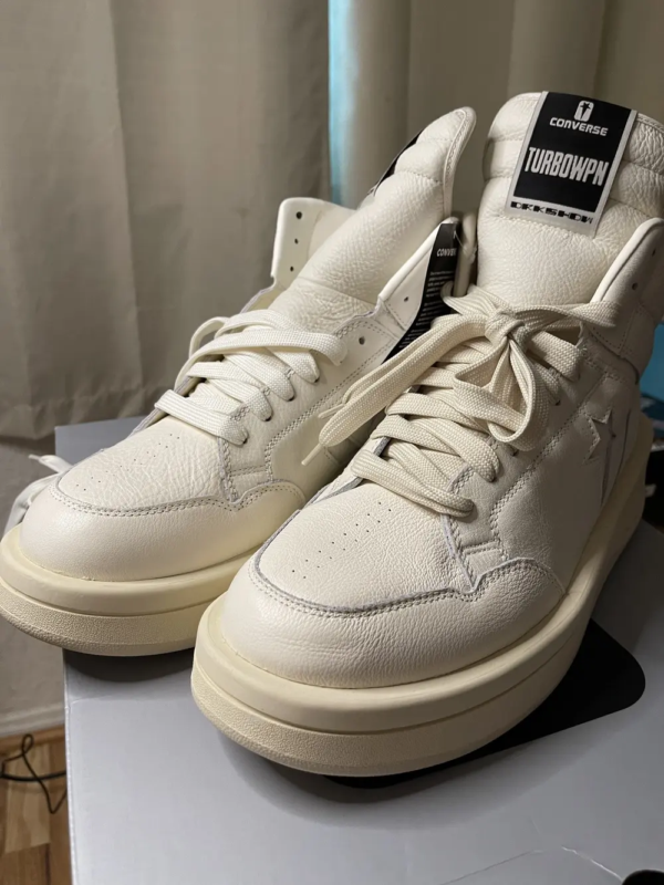 The Rick Owens DRKSHDW x Converse TURBOWPN Mid 'Egret' is another compelling collaboration between Rick Owens' DRKSHDW line and Converse, known for merging high-fashion aesthetics with classic sneaker elements.
