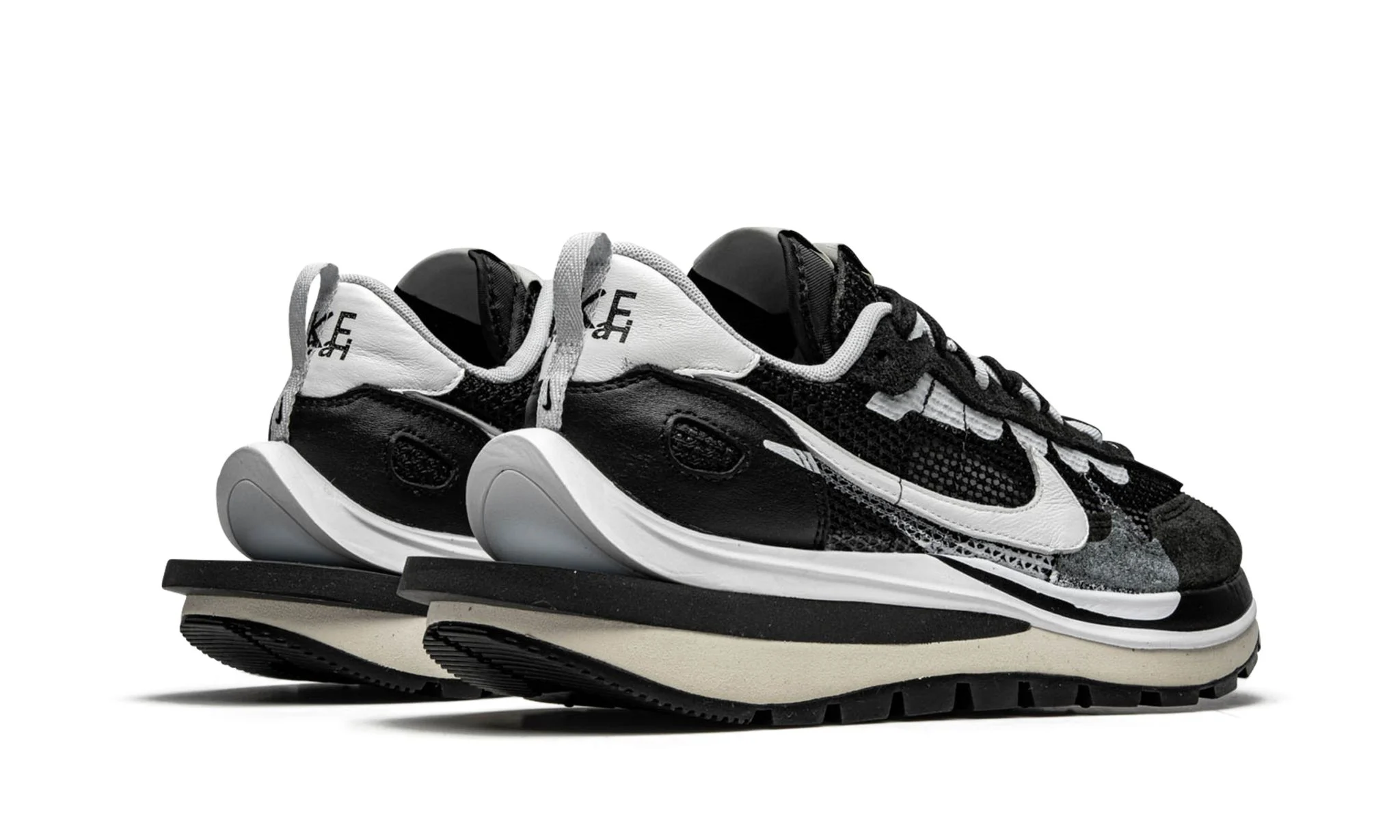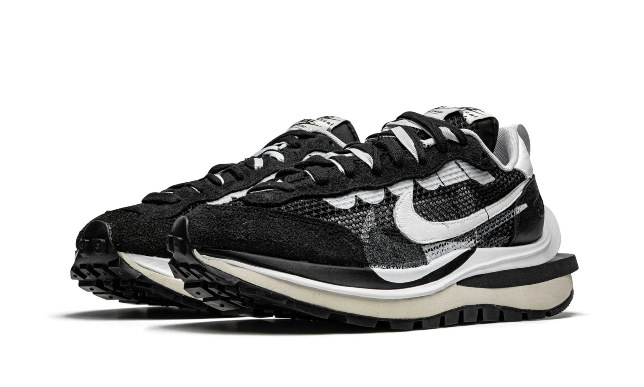 The 'Black White' colorway features a contrast of black and white tones, creating a timeless and versatile look. The upper is crafted from a mix of premium materials including mesh, suede, and leather, showcasing Sacai's meticulous attention to detail. One of the defining characteristics of the Sacai x Nike VaporWaffle 'Black White' is its double-layered design, which includes double Swooshes, double tongues, and double laces. This innovative approach not only enhances the shoe's visual appeal but also adds depth and texture.