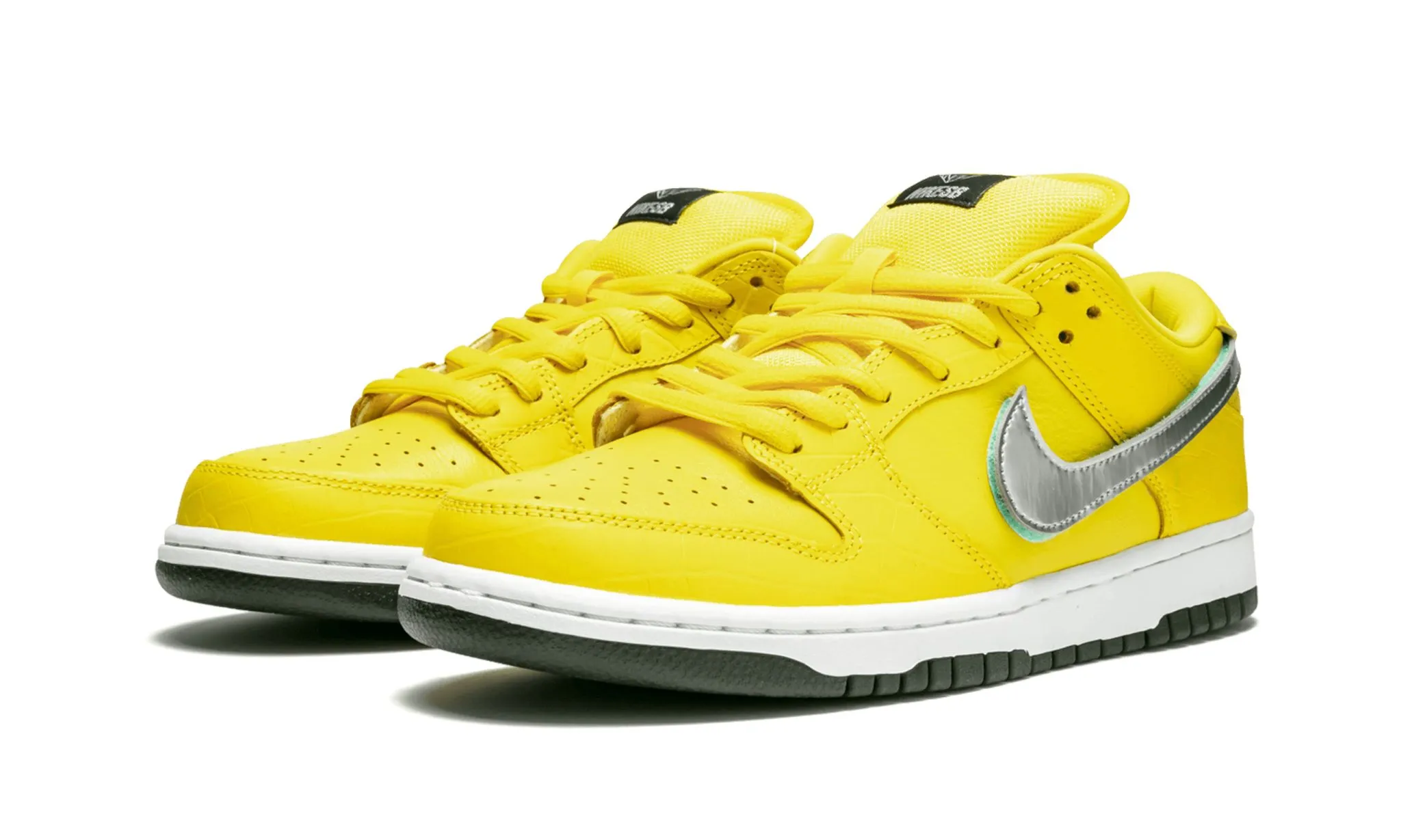 The SB Dunk Low Pro x Diamond Supply Co. 'Canary Diamond' is a luxurious collaboration that exudes sophistication and streetwear style. Featuring a premium suede upper in vibrant yellow, reminiscent of a canary diamond's brilliance, the shoe captures attention with its bold color choice. The design is complemented by contrasting black accents on the Nike Swoosh, laces, and heel tab, along with Diamond Supply Co.'s iconic logo embroidered on the tongue. Additional details include a translucent outsole with a diamond pattern visible underneath, adding a touch of exclusivity. This release is celebrated for its meticulous craftsmanship and attention to detail, making the SB Dunk Low Pro x Diamond Supply Co. 'Canary Diamond' a coveted addition to any sneaker collection, blending skateboarding functionality with high-fashion aesthetics seamlessly.