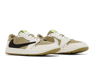 The Travis Scott x Air Jordan 1 Low Golf 'Neutral Olive' combines the iconic Air Jordan 1 silhouette with Travis Scott's unique interpretation for the golf course. Featuring a 'Neutral Olive' colorway, these sneakers blend premium materials such as suede and leather, offering a luxurious and durable build. The design incorporates Scott's signature aesthetic with distinct branding elements, including the embroidered Cactus Jack logo on the heel. Equipped with a modified outsole for enhanced traction and stability on the golf course, these shoes also feature Zoom Air cushioning for responsive comfort. The Travis Scott x Air Jordan 1 Low Golf 'Neutral Olive' represents a fusion of sporty sophistication and streetwear flair, making it a standout choice for both golf enthusiasts and sneaker collectors.