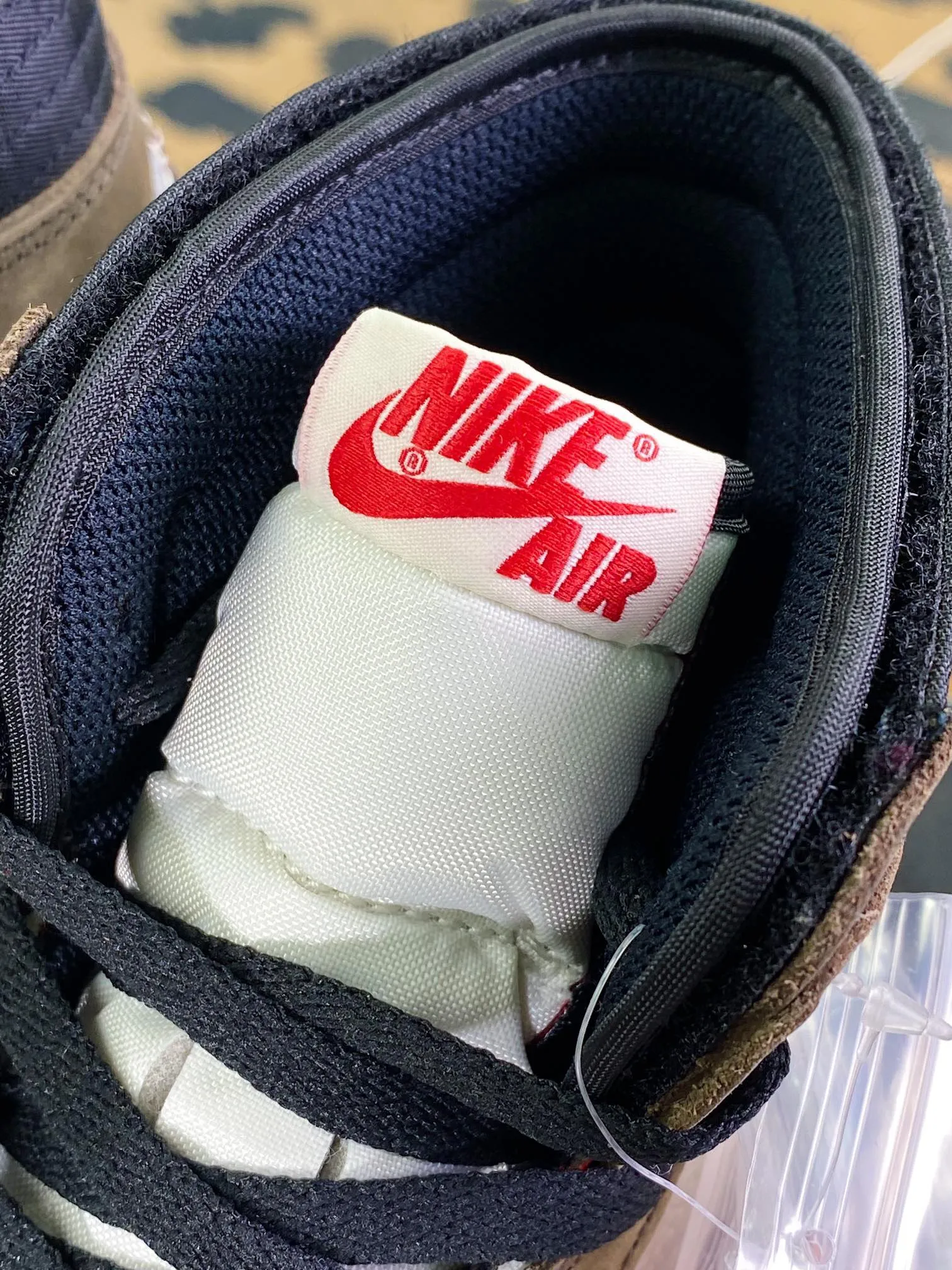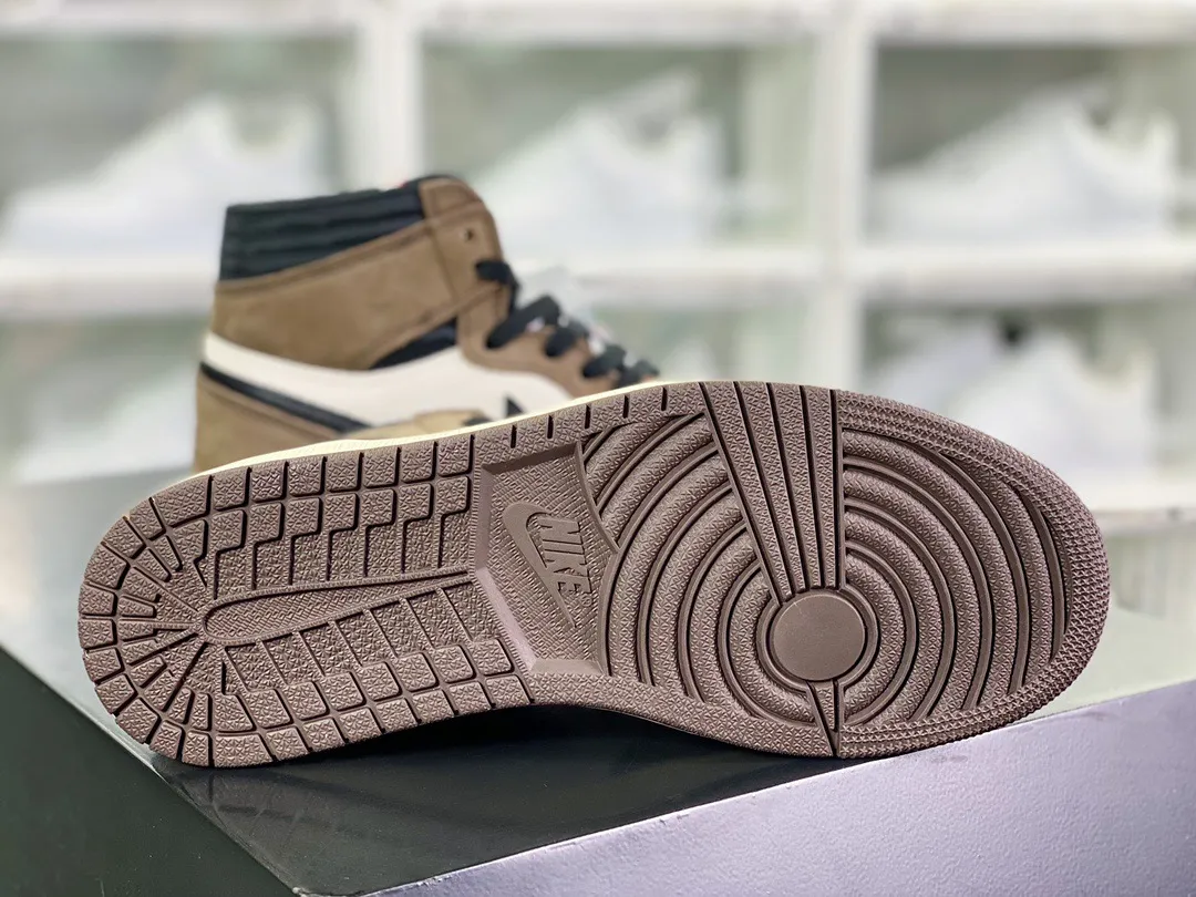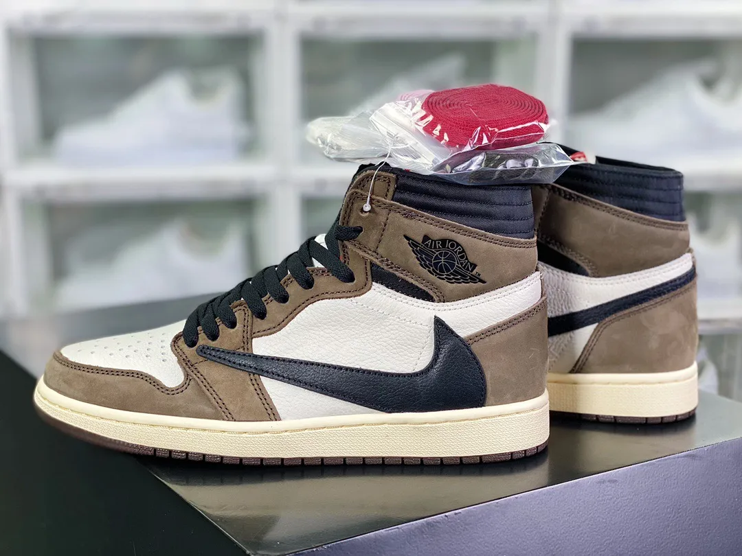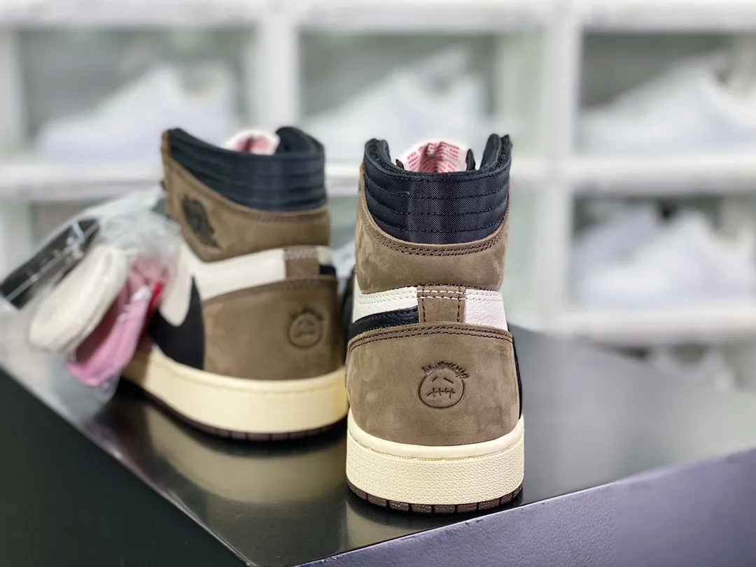The Travis Scott x Air Jordan 1 High OG is the limited edition collaboration from the rap superstar and Jordan Brand on the iconic silhouette that features a major twist. One look at the Travis Scott x Air Jordan 1 and you’ll notice the backwards Swoosh across the upper, a first for the legendary silhouette. Travis Scott’s Air Jordan 1 also features a premium construction in Sail leather and Dark Mocha nubuck with black accents. The Jordan 1 is further modified with a padded nylon collar that has a hidden stash pocket. Each pair is completed with Scott’s “face” logo embossed on the heels and a “Cactus Jack” logo on the right insole.