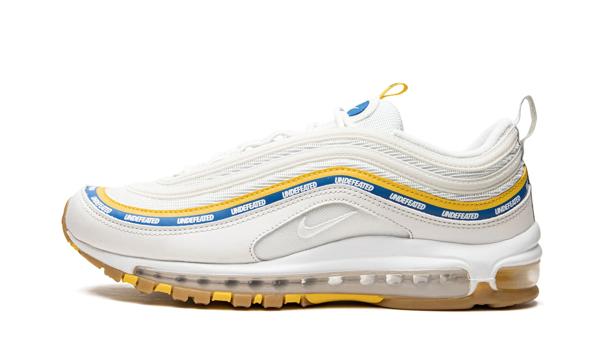 The Undefeated x Nike Air Max 97 “UCLA” is a special collaboration between the Los Angeles sneaker boutique and Nike that references the team uniform colors of the UCLA Bruins. Undefeated, a California based sneaker boutique, shares the same home city of the Bruins, the school in which this colorway of the Air Max 97 is loosely based on. Midwest Gold and Aero Blue detailing can be found on embroidered Nike branding on the tongue and pull tab. The Bruin-themed color combination also appears on the piping above the white leather mudguard and on the insoles. Undefeated outfits the upper’s mesh detailing in white to match the rest of the leather piping. Blue Air Max branding is located on the heel. Underfoot, a full length visible Air cushioning unit provides a supportive ride to the wearer.