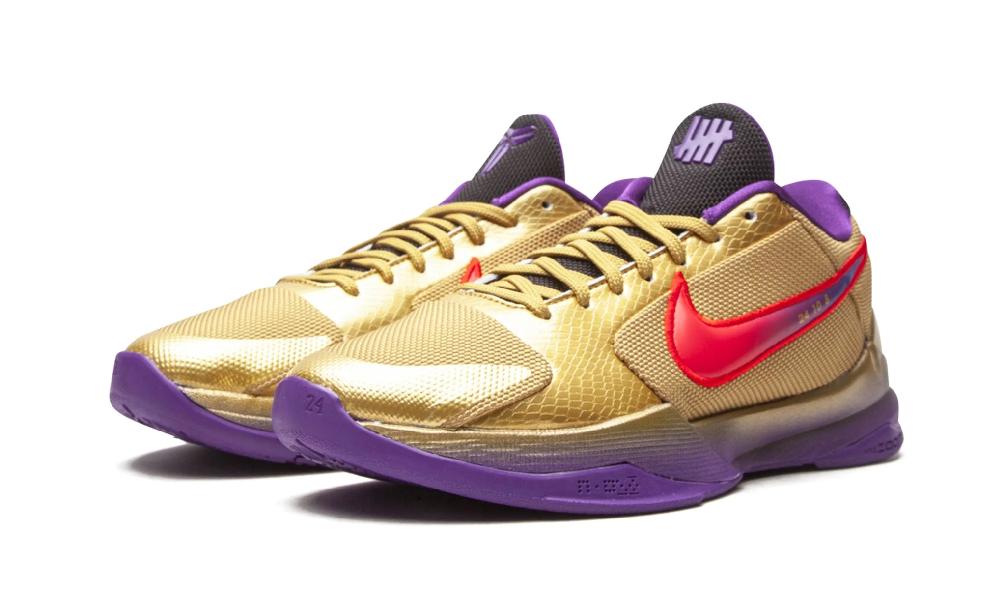 The Undefeated x Nike Kobe 5 Protro “Hall of Fame” is a special collaboration between the California based sneaker boutique and Nike Basketball that celebrates Kobe Bryant’s introduction to the Basketball Hall of Fame in 2021. The Nike Kobe 5 Protro, one of Bryant’s most beloved signature shoes, displays a luxurious metallic gold finish as a salute to the “Black Mamba’s” five NBA Championships. The upper’s lightweight gold mesh base is contrasted by tonal snakeskin-textured leather overlays on the forefoot and eyelets. Both the left and right shoe feature a red leather Swoosh, with purple accenting the Swoosh on the left shoe and pink accenting the Swoosh on the right shoe. The left shoe’s Swoosh displays Kobe’s “24,” “10,” and “8” jersey numbers with the Los Angeles Lakers and Olympic Team USA as a commemoration of his basketball career. Both the tongue and the heel display additional mismatched detailing in the way of Kobe’s “The Sheath” and Undefeated’s “Five Strikes” branding.
