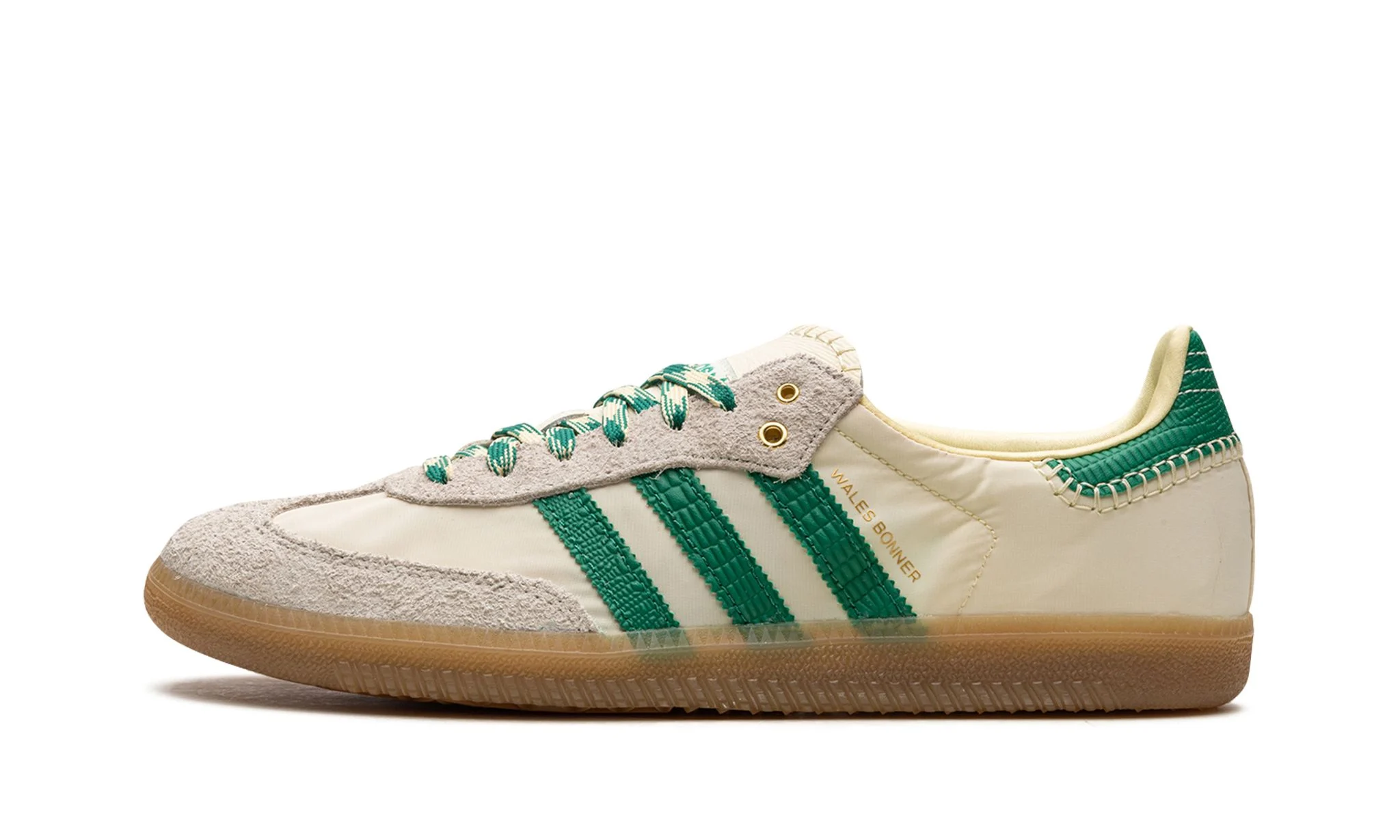 The Wales Bonner x Adidas Samba 'Cream White Bold Green' collaboration merges sophisticated design with athletic heritage, presenting a unique interpretation of the classic Samba silhouette. Crafted from premium materials such as leather and suede, these sneakers prioritize both durability and comfort. The 'Cream White Bold Green' colorway combines a creamy white base with bold green accents, creating a striking and harmonious contrast.