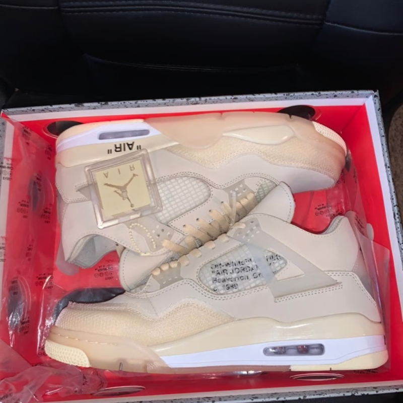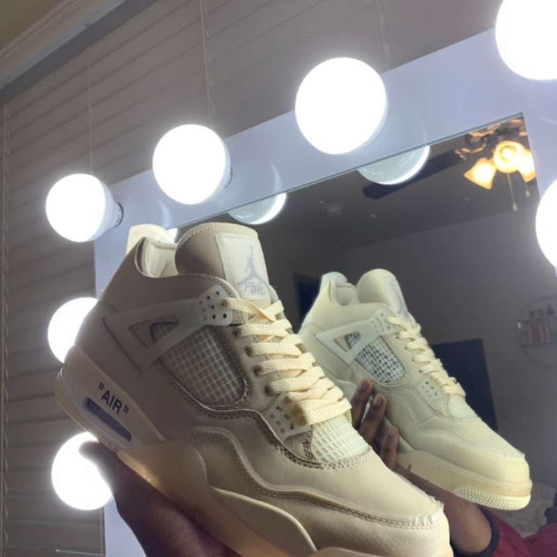 The women's Off-White x Air Jordan 4 “Sail” is a highly desirable collaboration between Virgil Abloh’s fashion label and Jordan Brand on Michael Jordan’s fourth signature shoe. Originating as a sample during Abloh’s “Figures of Speech” exhibit in Chicago’s Museum of Contemporary Art in Fall 2019, this clean colorway received an official retail release in Summer 2020 to much fanfare. The signature “quotations” aesthetic of Abloh’s Jordan Brand collaborations underpins this Sail colored shoe, including “Air” branding printed on the midsole and “shoelace” detailing in black lettering on the laces. Translucent detailing, including the heel cup, Wings clips on the collar, and netting on the midsole and throat are all firsts for the Jordan 4. The visible Air window in the heel is surrounded by a white midsole.