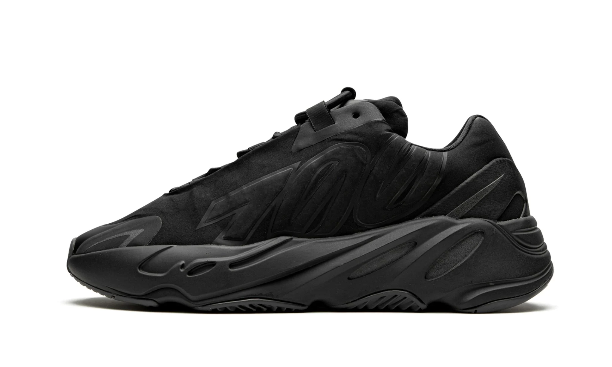 The Yeezy Boost 700 MNVN 'Triple Black' embodies a sleek and stealthy aesthetic, featuring a monochromatic black colorway throughout its design. The upper is constructed from lightweight nylon with no-sew overlays, ensuring a modern and minimalist look while maintaining durability. Bold reflective "700" branding on the lateral side adds a distinctive touch, enhancing visibility in low-light conditions. The shoe is equipped with a full-length Boost midsole for responsive cushioning and comfort, ideal for all-day wear. A rugged gum rubber outsole provides reliable traction and durability, completing the shoe's functional appeal. The Yeezy Boost 700 MNVN 'Triple Black' is a versatile choice that merges urban style with performance, suitable for various casual and streetwear outfits.