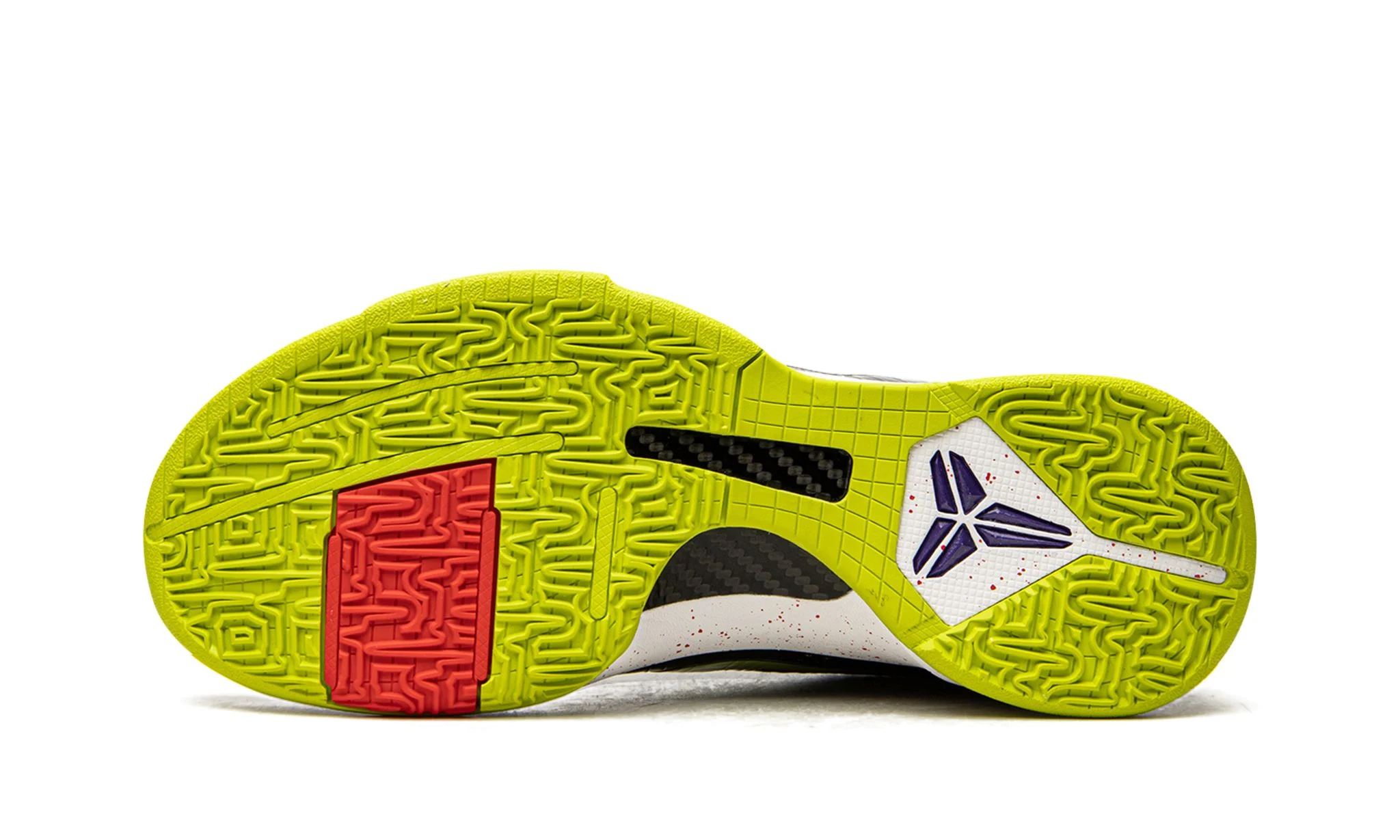 The Nike Kobe 5 Protro “Chaos” is a celebratory colorway of Kobe Bryant’s signature shoe that salutes the DC Comics villain character, the Joker. This popular and classic design from Nike Basketball was first issued back in 2009. Bryant wore the look for the Los Angeles Lakers’ Christmas Day game that season, and Nike officially released the shoe a day later. In 2020, the “Chaos” returned for the first time as a retro model. The upper features a Chameleon upper with Cyber Purple leather dotting the toe and mid-panel. White leather detailing extends along the eyelets and forefoot to the white rubber midsole with red speckle accenting. A Lime Green Swoosh appears on either side and dark red rope laces sit atop the grey mesh tongue. An Additional mesh is seen on the quarter panel. Red nylon and a grey plastic heel cup with Kobe Bryant’s signature in green, as well as his signature "Nike Kobe" emblem on the tongue, adds to the true-to-original design of this performance basketball shoe.