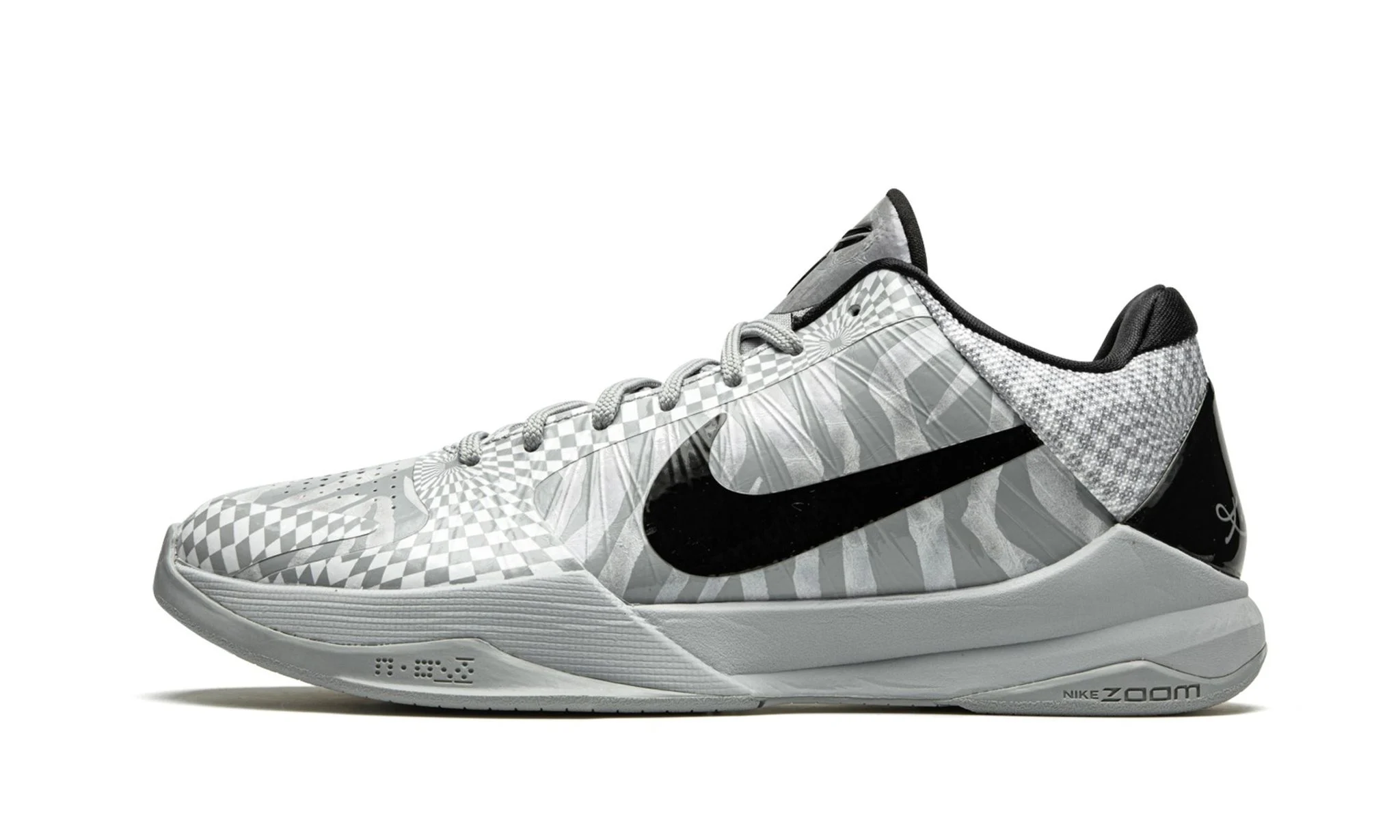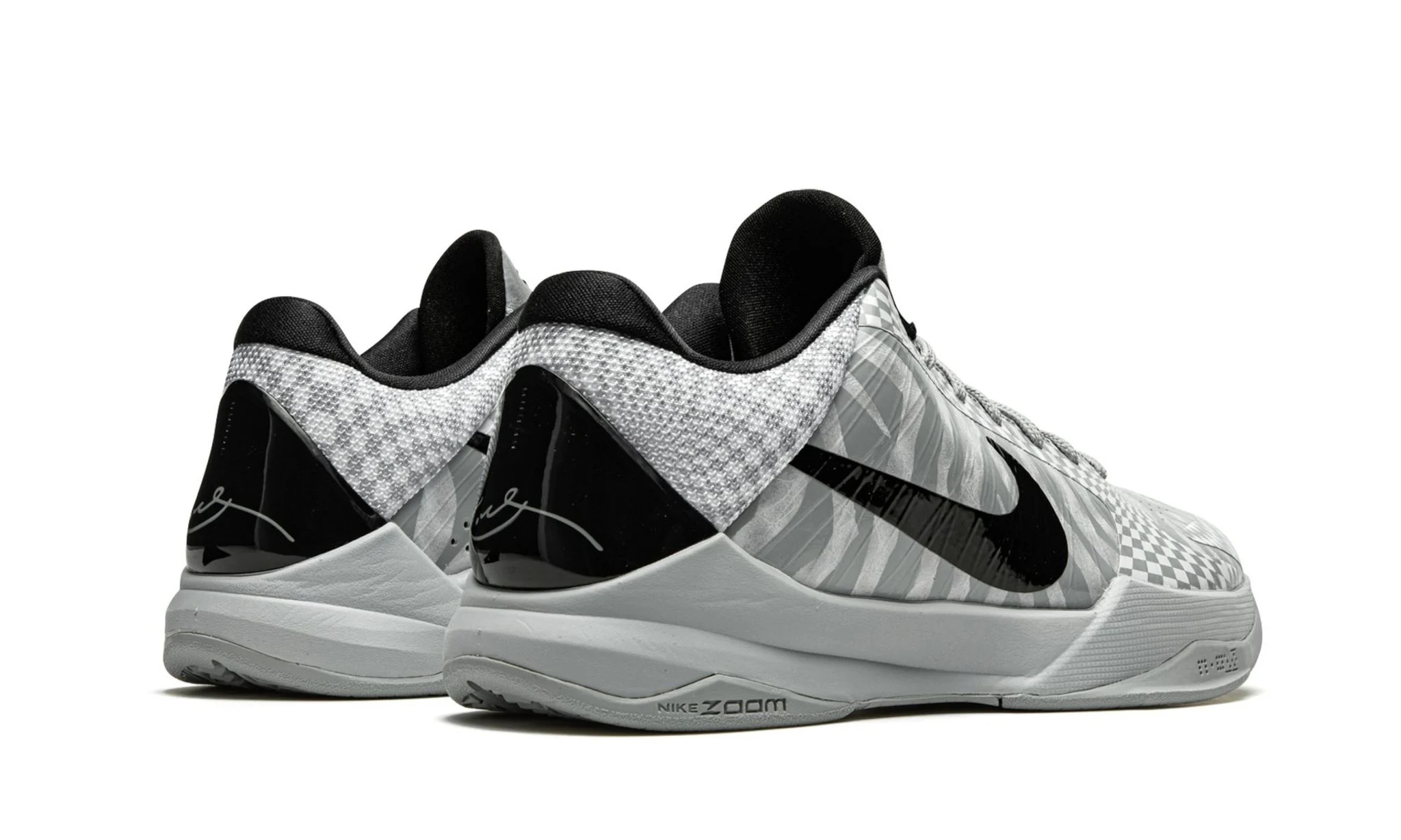 The Nike Kobe 5 Protro “DeMar DeRozan PE” is the player exclusive colorway of Kobe Bryant’s signature shoe made for the San Antonio Spurs’ shooting guard. This releases is one of several player exclusive Nike Kobe 5 Protro designs released by Nike Basketball in Fall 2020. A multidirectional checkerboard pattern in Wolf Grey and black appears on the forefoot, toe, and eyelets. A zebra-like pattern in the same color scheme can be found on the mid-panel. A black Swoosh can be found on either side. Additional design elements include grey mesh around the collar and heel, a black heel cup with Bryant’s signature, and black Mamba detailing on the tongue. Nike’s Zoom Air cushioning technology is embedded within the forefoot and heel and provides top level comfort.