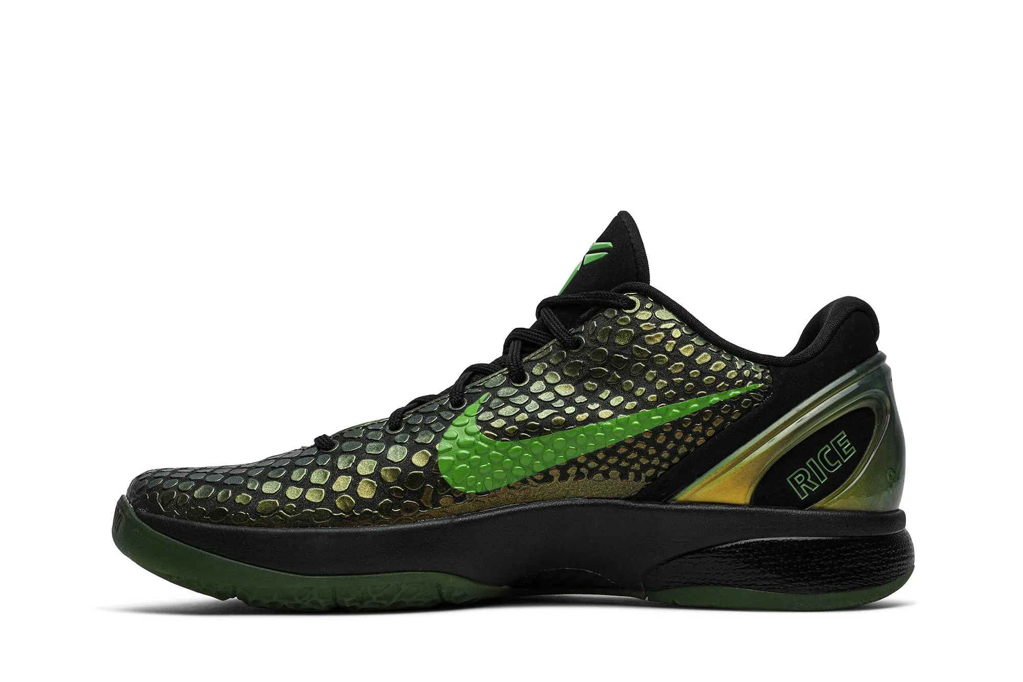 The Zoom Kobe 6 Supreme 'Rice' is a distinctive iteration of Kobe Bryant's sixth signature shoe, inspired by his appreciation for Asian culture and cuisine. This special edition features a color palette reminiscent of traditional Asian rice, with a predominantly white upper accented by subtle hints of green and gold. The shoe's design incorporates synthetic overlays for durability and support, while a Zoom Air unit in the heel provides responsive cushioning ideal for basketball performance. Detailing includes Kobe's logo on the tongue and heel, as well as unique graphics and patterns that pay homage to his connection with Asian heritage. The Zoom Kobe 6 Supreme 'Rice' combines cultural influence with athletic functionality, making it a sought-after choice among sneaker enthusiasts and Kobe Bryant fans alike.